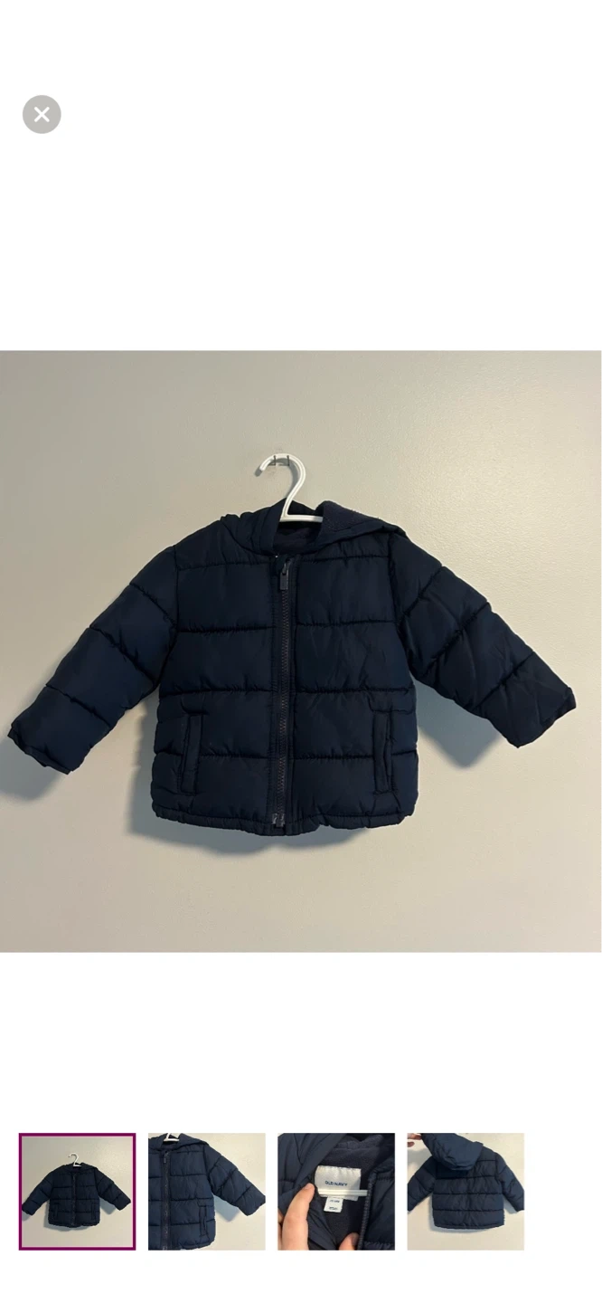 Old navy brand. Zip up hooded puffer jacket. Navy blue in colour. Size 12/18m. Brand new condition $10