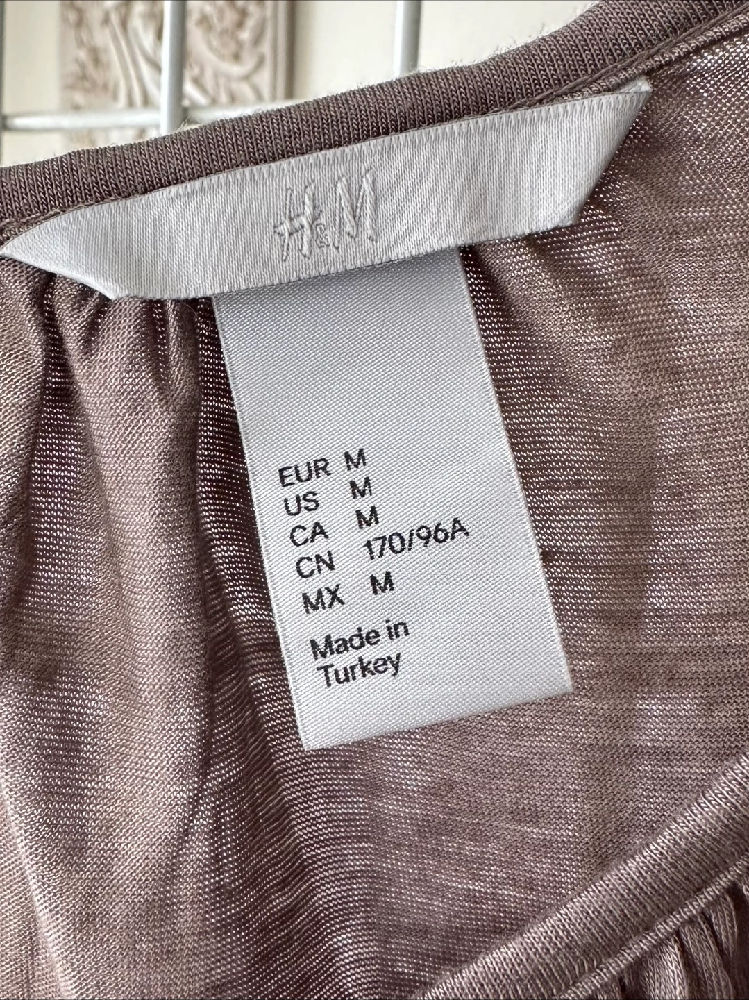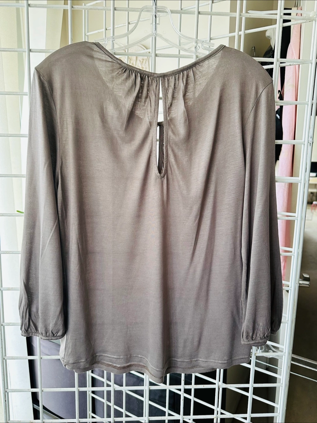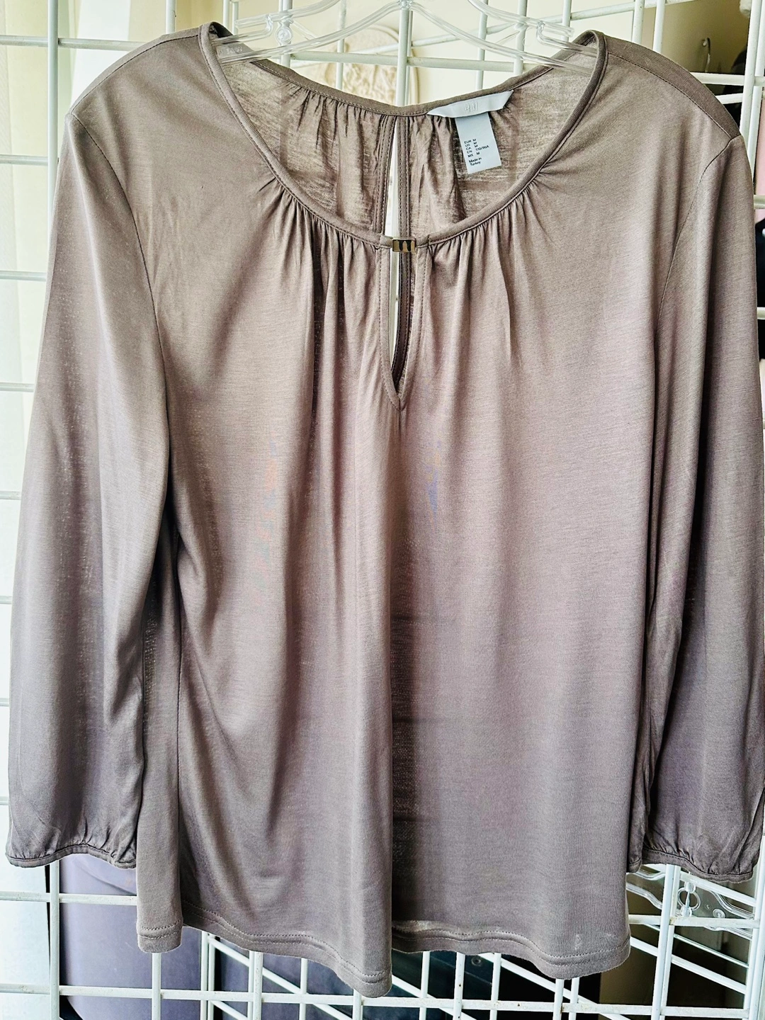 Grey-brown H&M blouse. Size medium. Three-quarter sleeves. Keyhole neckline detail at back. Relaxed fit. Made in Turkey.
