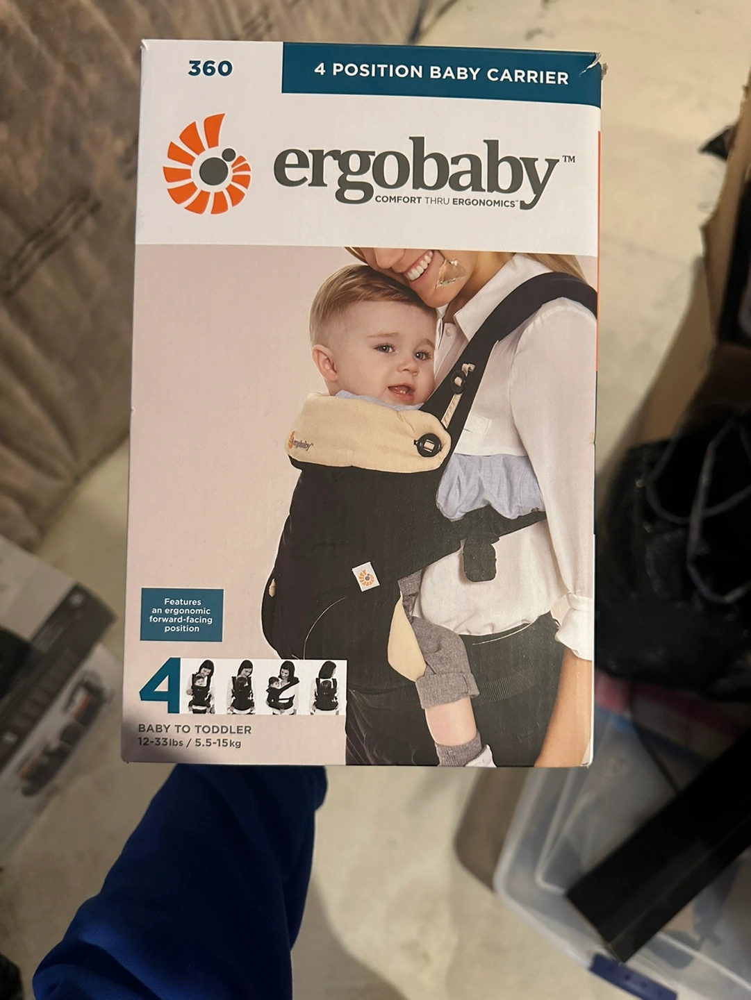 This carrier is black and camel in colour and is designed for babies from 12-33lbs. It has four carrying positions, including front inward facing, front outward facing, hip carry, and back carry.