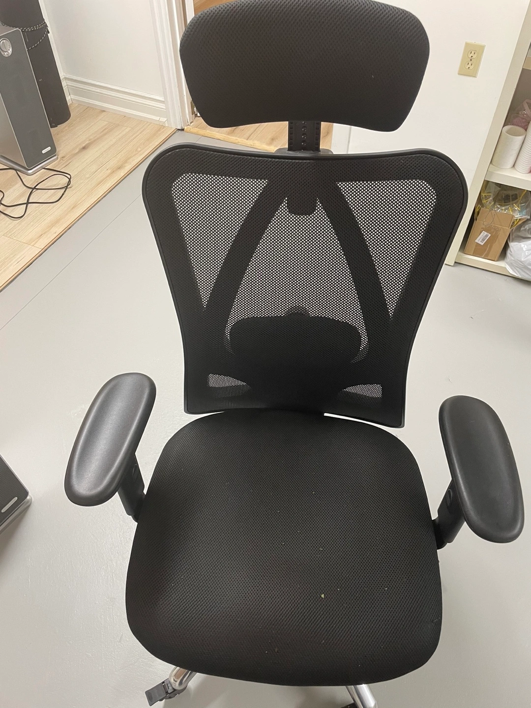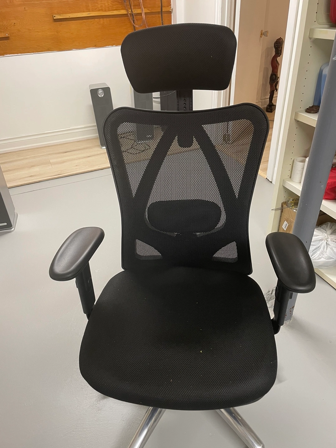 Selling a comfortable ergonomic mesh office chair. It's in great shape and ready for a new home office! The chair features a breathable mesh back, adjustable headrest, and sturdy chrome base. Perfect for long hours of work or study!
