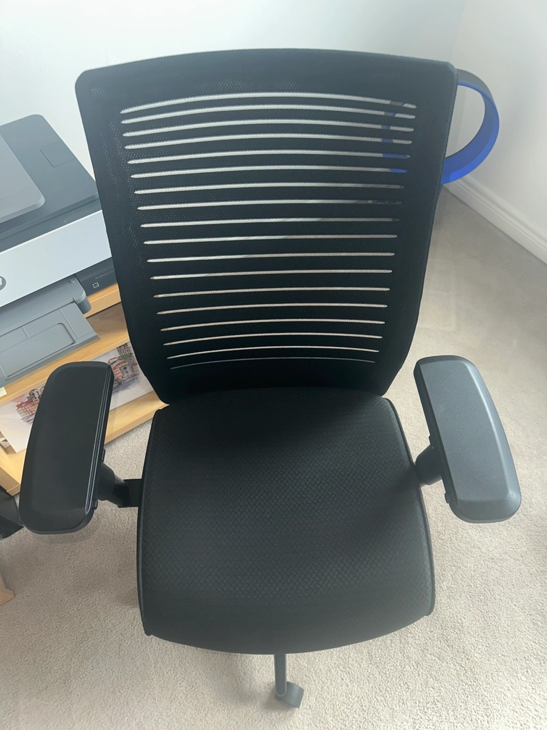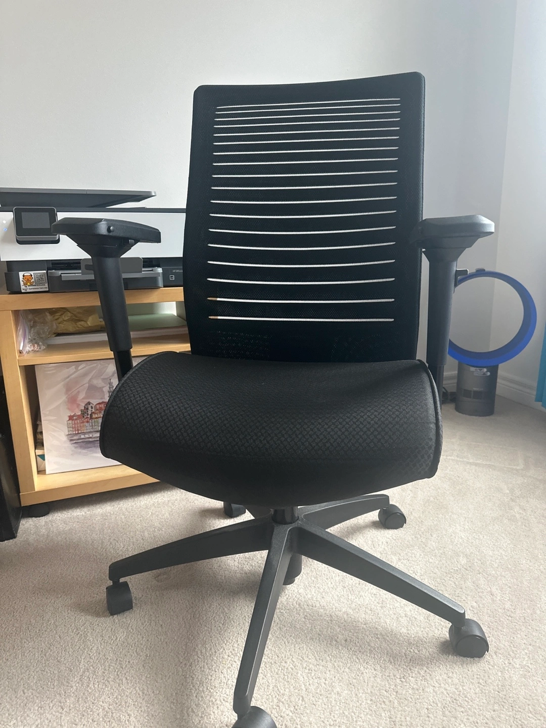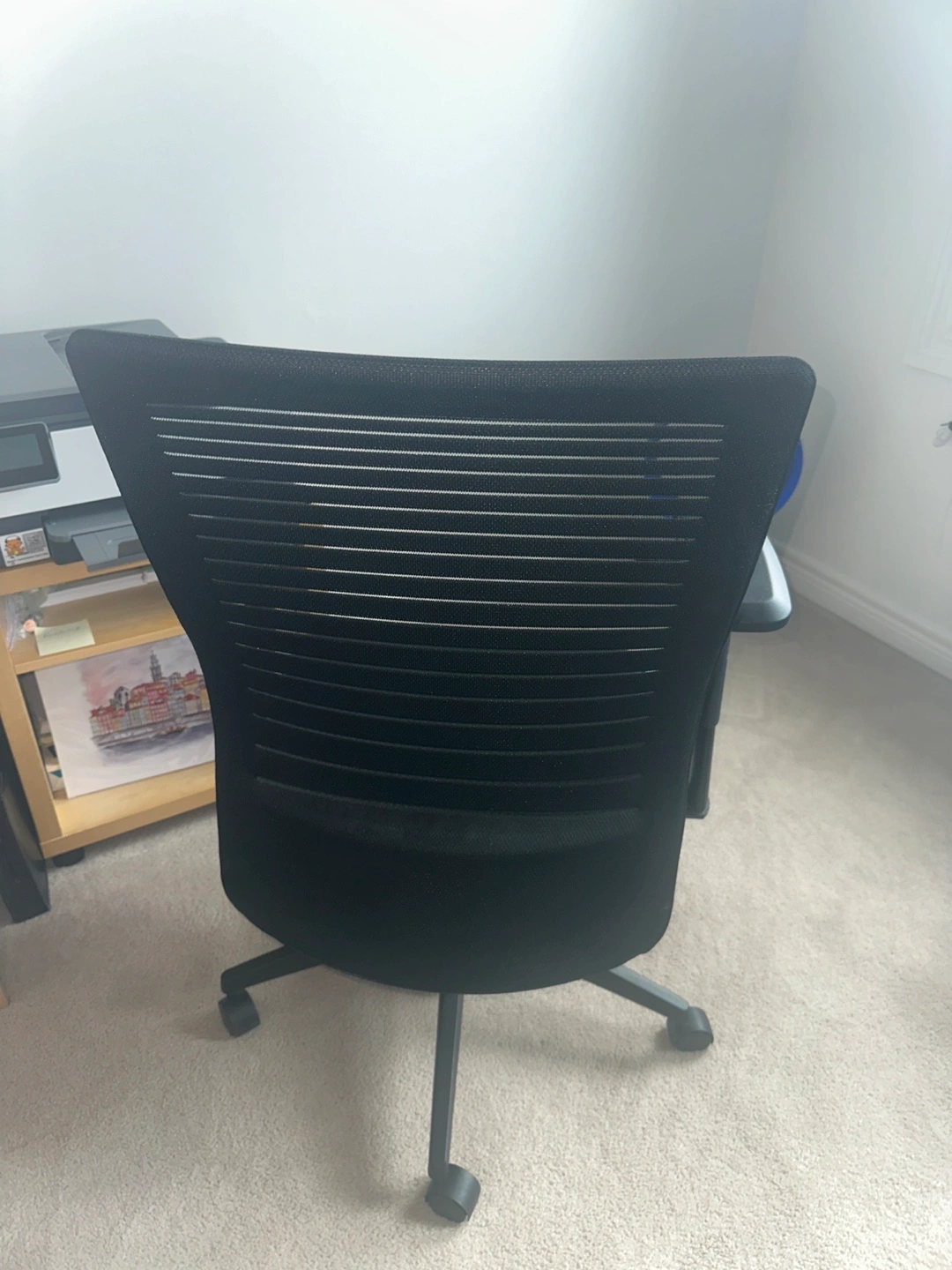 Office chair features an ergonomic design with an "S" backrest and independent lumbar support, relieving spinal pressure. The premium mesh lumbar support optimizes ventilation and heat dissipation while offering precise relief for your waist's pressure, ensuring comfort during prolonged sitting. Our ergonomic chair offers effortless adjustment with one lever for seat height and reclining, with 3 tilt recline angles 90°-120°-145°. Armrests adjust within 3" in height. Crafted from high-quality mesh material, our ergonomic desk chair is supportive, breathable, and long-lasting. Easy cleaning and maintenance ensure it remains reliable for years. The thick cushion seat eases sedentary pressure for comfortable extended sitting. Adjustable Black mesh back , armrests and seat. Five-star base with casters. Exellent condition.