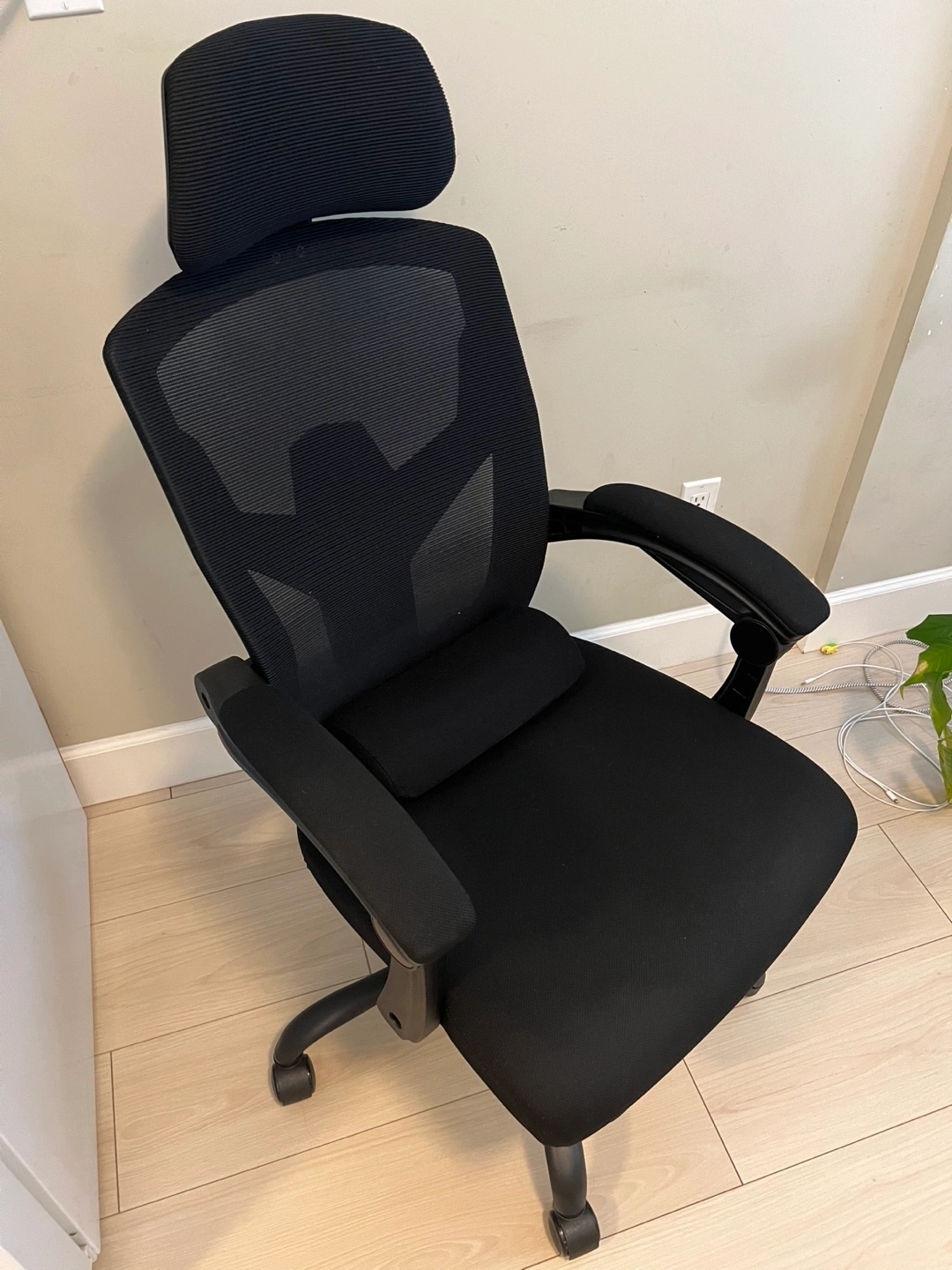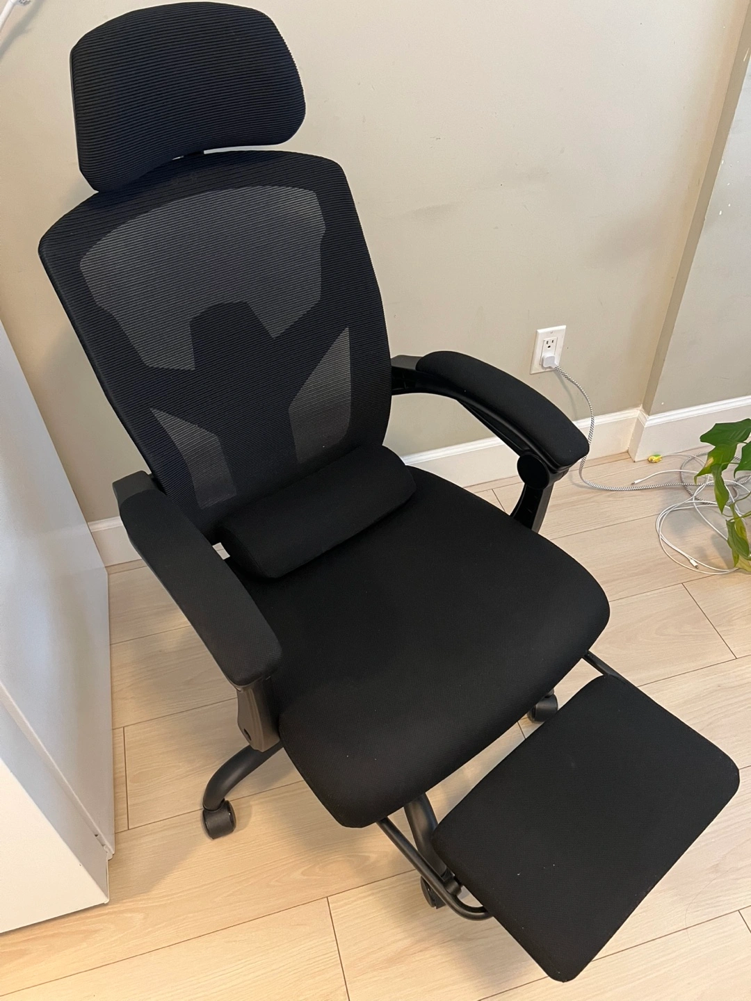 68Black mesh office chair with adjustable headrest, armrests, and lumbar support. Includes a footrest. The chair is comfortable and supportive, perfect for long days at work. Great condition. Original $200 Pickup only in Marpole area