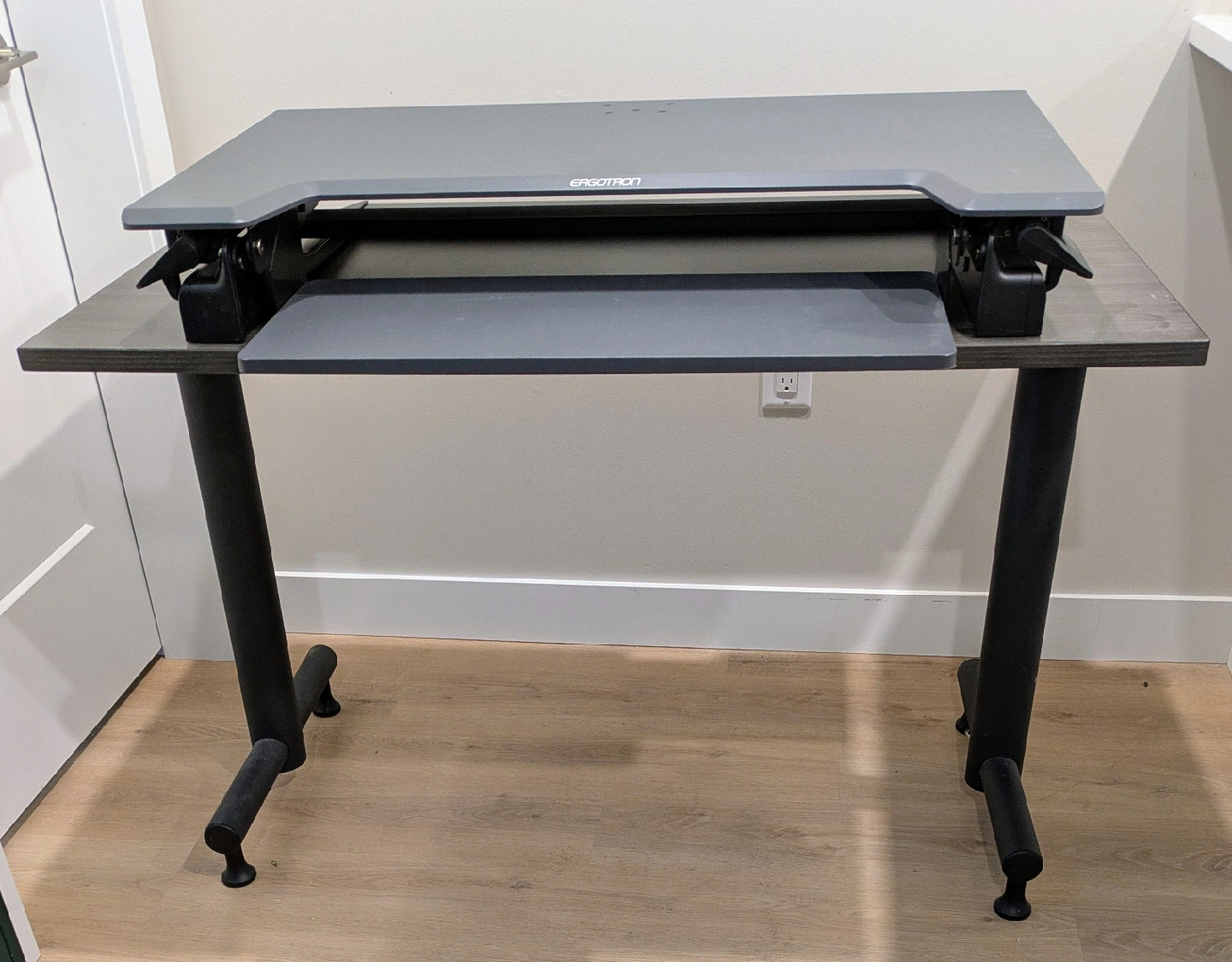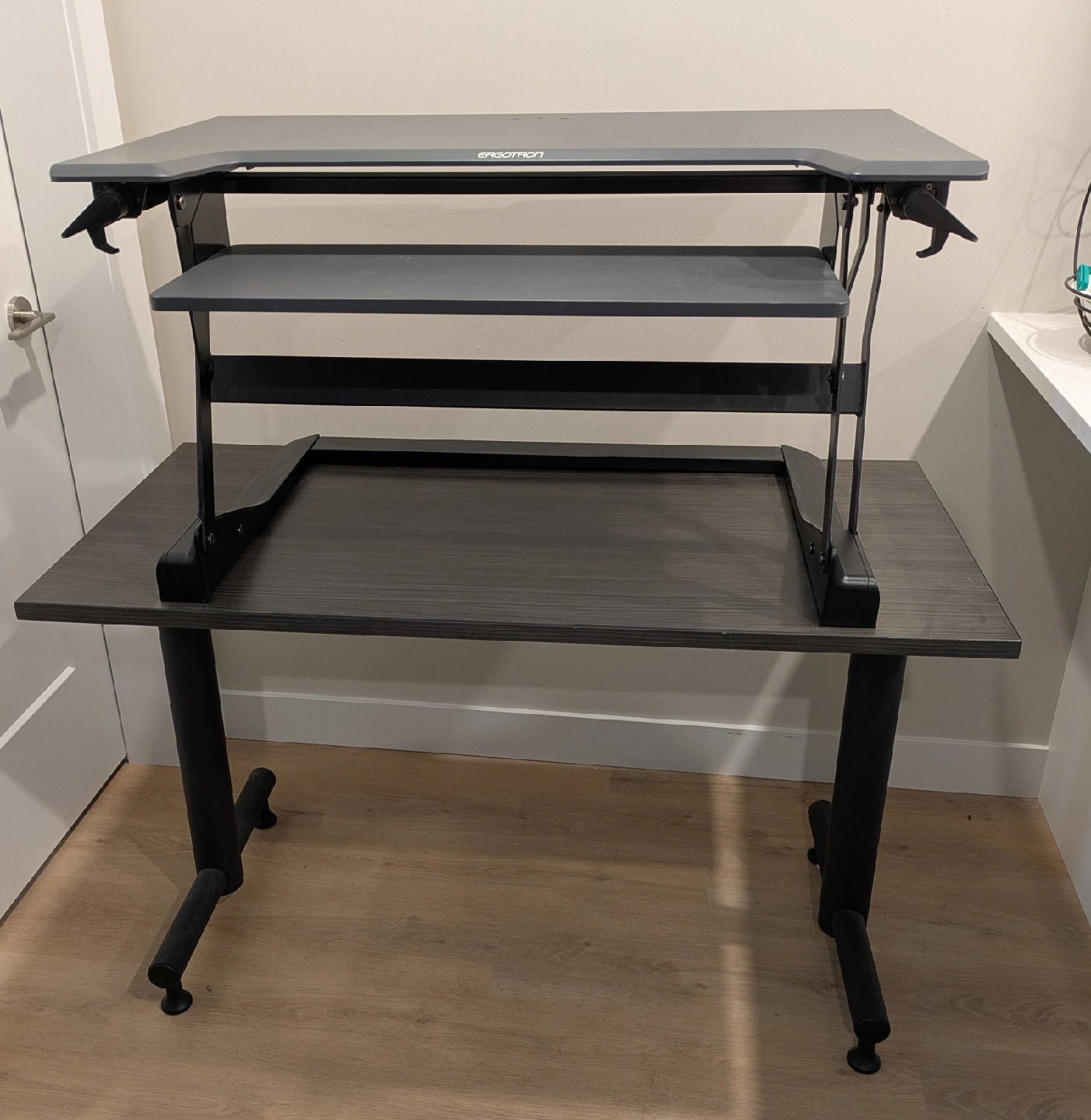 Sold as a set. Main table 47.5 “ long by 23.5” deep. It stands 29.5” high, set height. This part does NOT adjust. The top adjustable part is 37.5 “ long by 23” deep. This part raises to a maximum 19.5”. This is great if you are in need of standing to do your work. Adjust back down if you need to sit again. The top adjustable part sells for between $800-$900 by itself. I am selling as a set for $500 O.B.O.