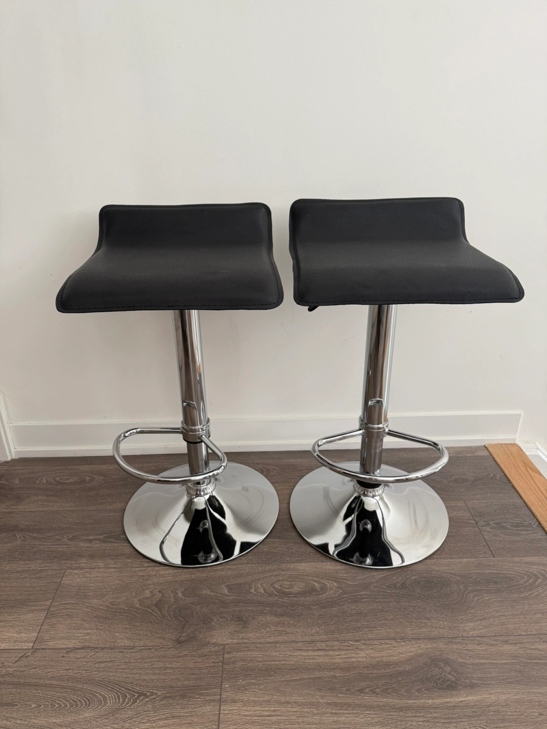 Selling a pair of bar stools with black seats and chrome bases. They're in great shape and would look great in any kitchen or bar area!