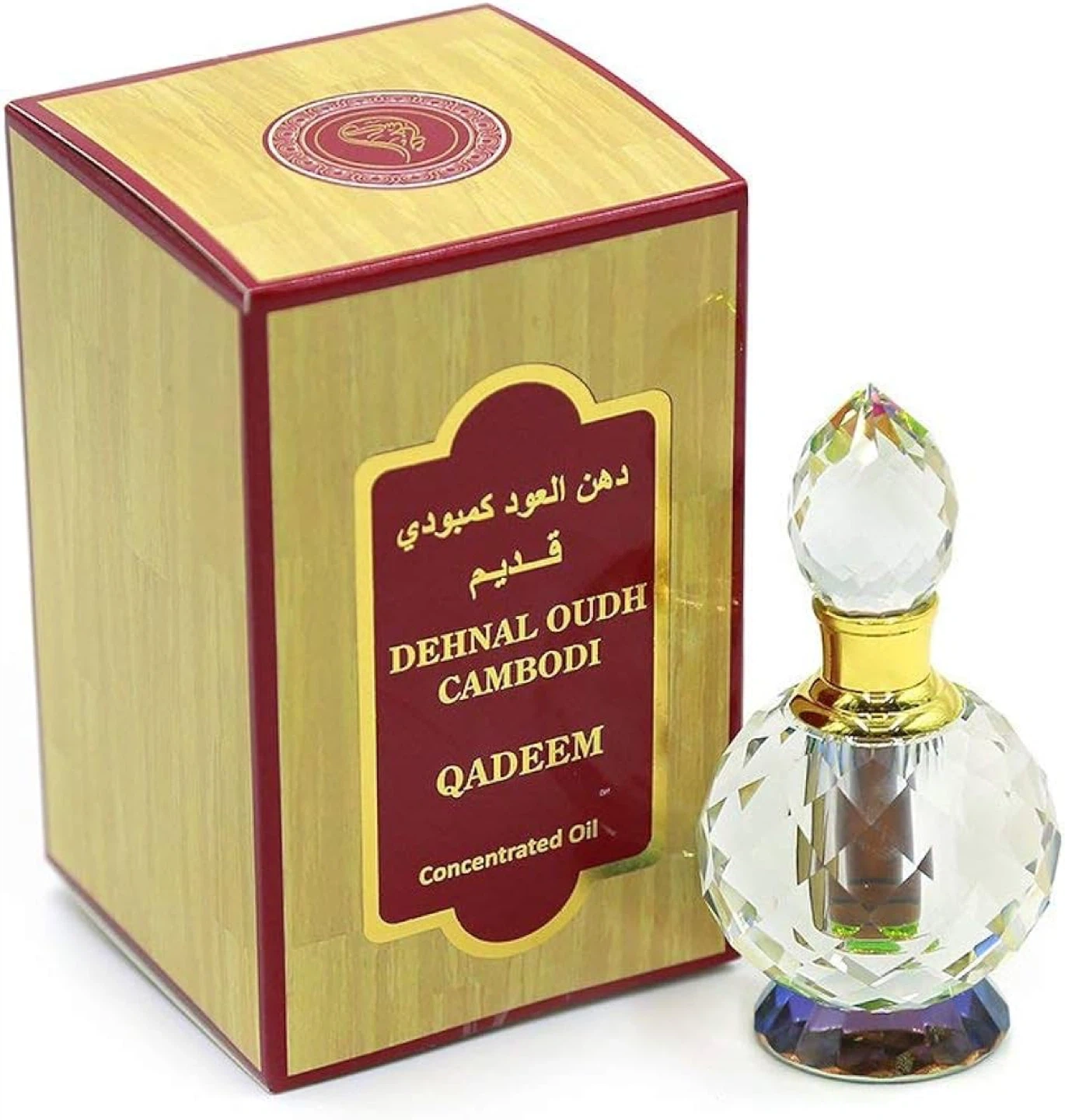 Dehnal Oudh Cambodi Qadeem concentrated oil. It's a rich, woody fragrance. This perfume oil is known for its intense and long-lasting scent profile. Comes in a decorative crystal bottle.