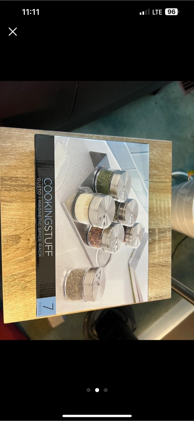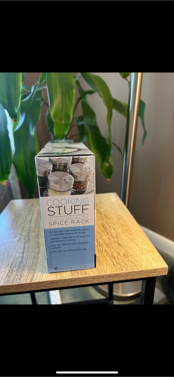 A spice rack with seven pieces. Includes jars with magnetic bases. Stainless steel lids jars can also stick on the fridge. Great for any kitchen setup. They also make a great gift