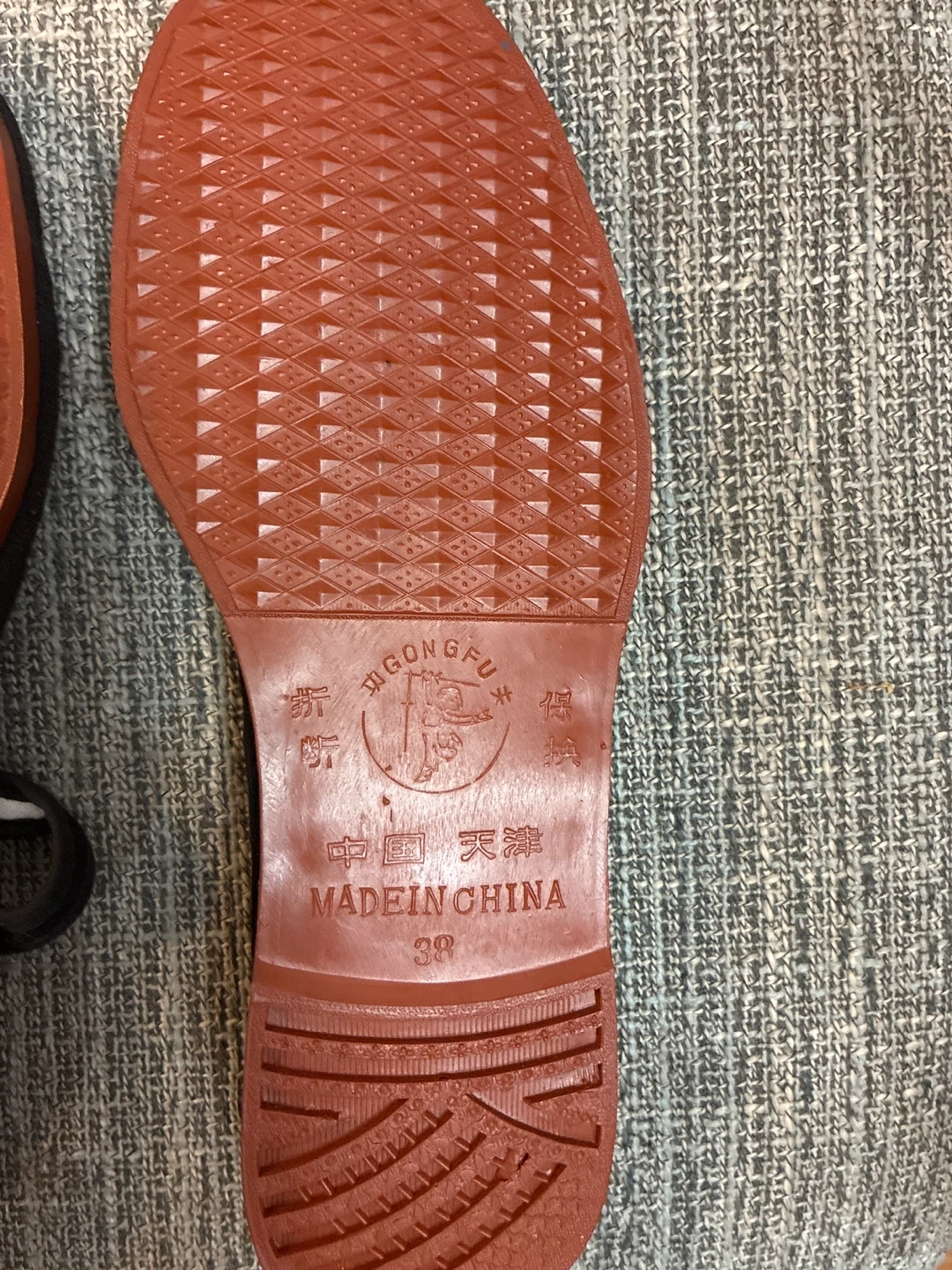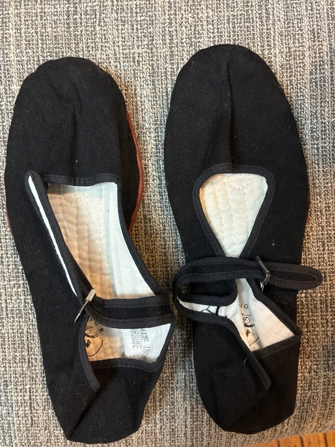 These are black fabric Kung Fu style shoes with adjustable straps and a red rubber sole. Made in China, size 38.