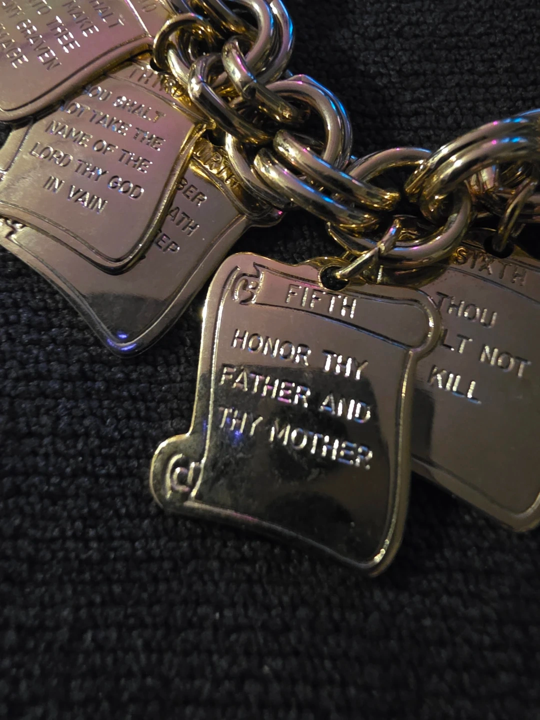 Gold tone charm bracelet with multiple charms, each engraved with one of the Ten Commandments. Clasp closure. Great for a statement piece!