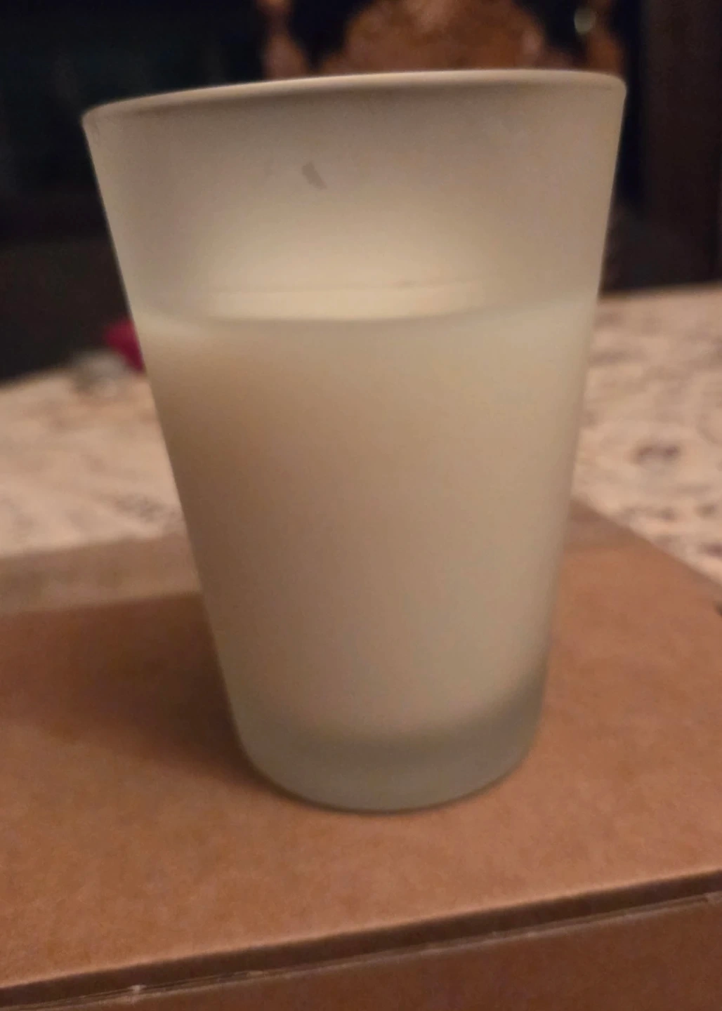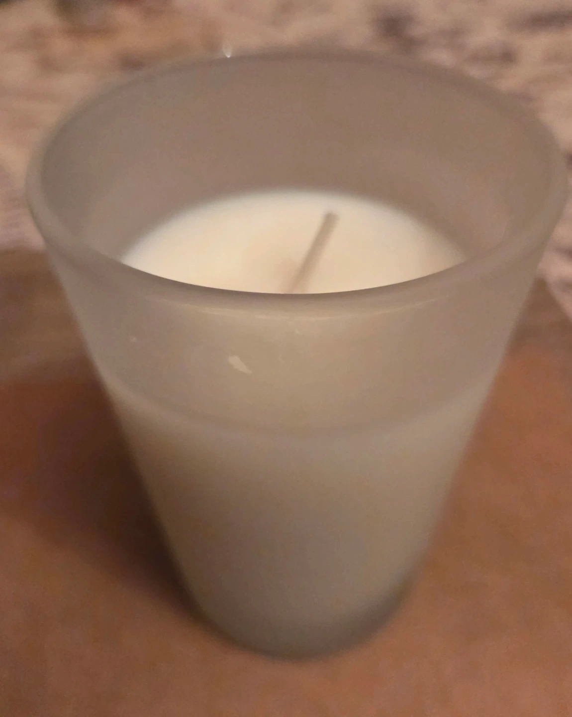 $8.00 white candle in frosted 4" tall holder