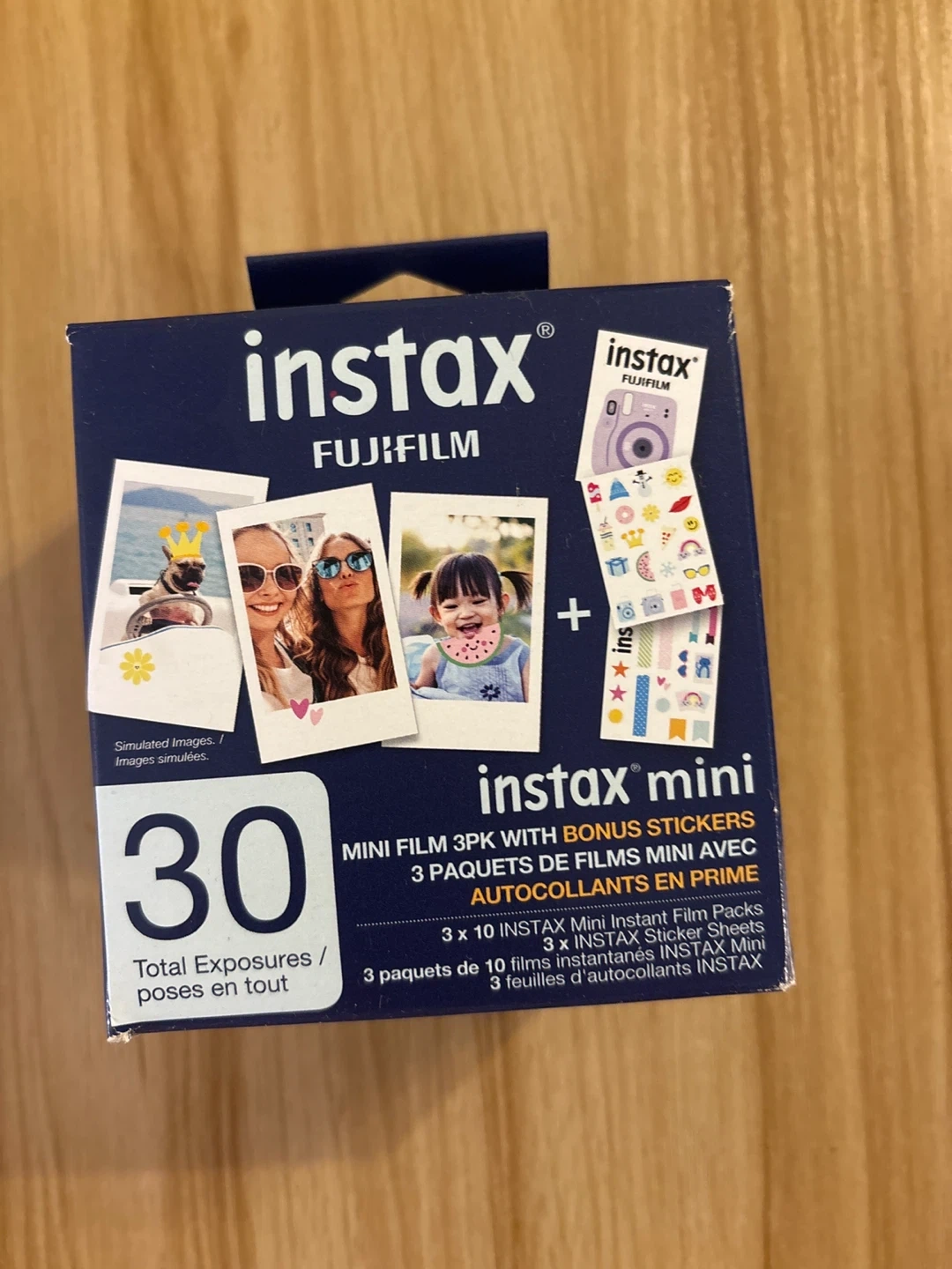 This is a 3-pack of Fujifilm Instax Mini instant film, offering a total of 30 exposures. It also includes bonus Instax Mini sticker sheets. Great for adding fun embellishments to your instant photos!