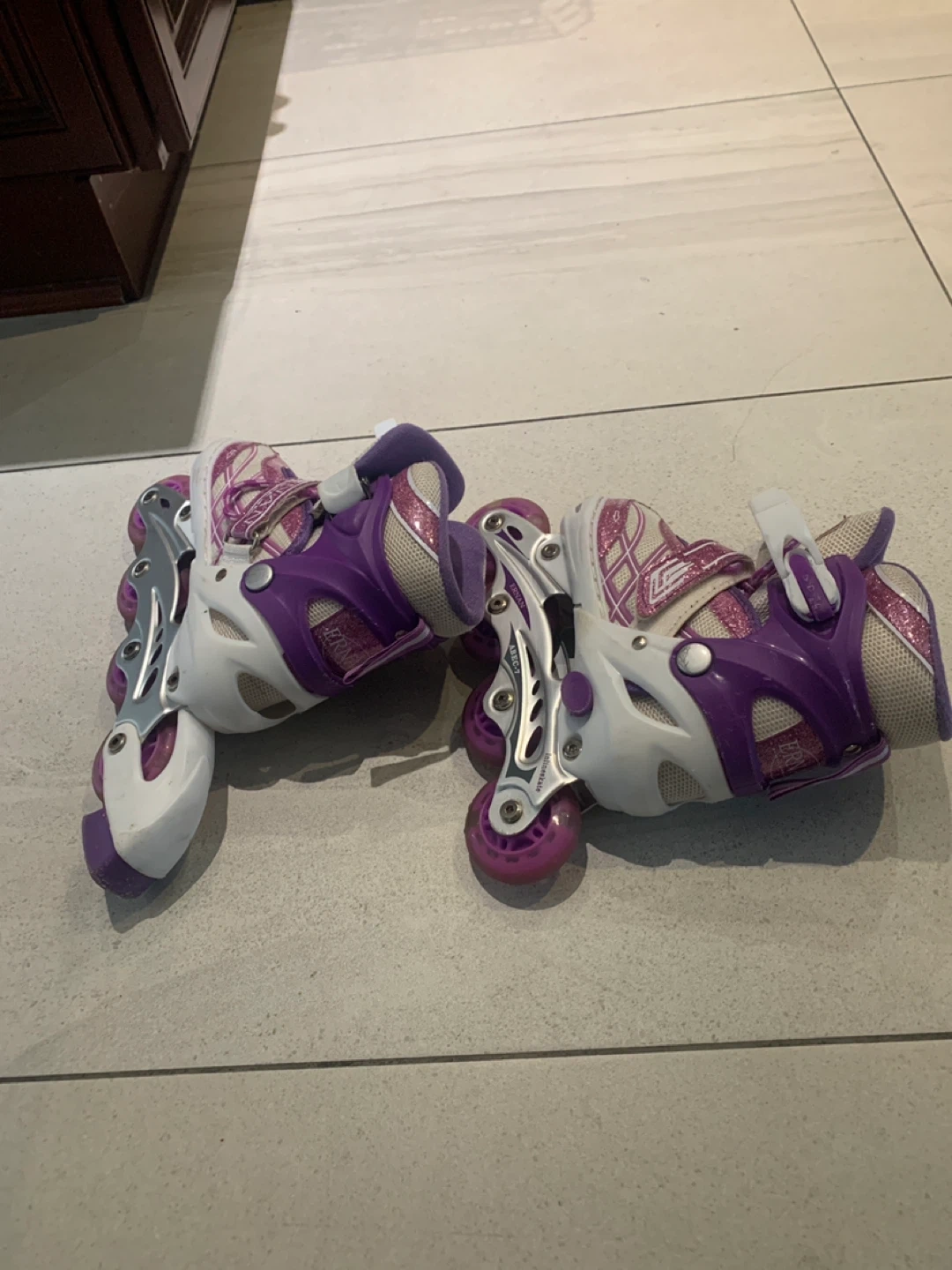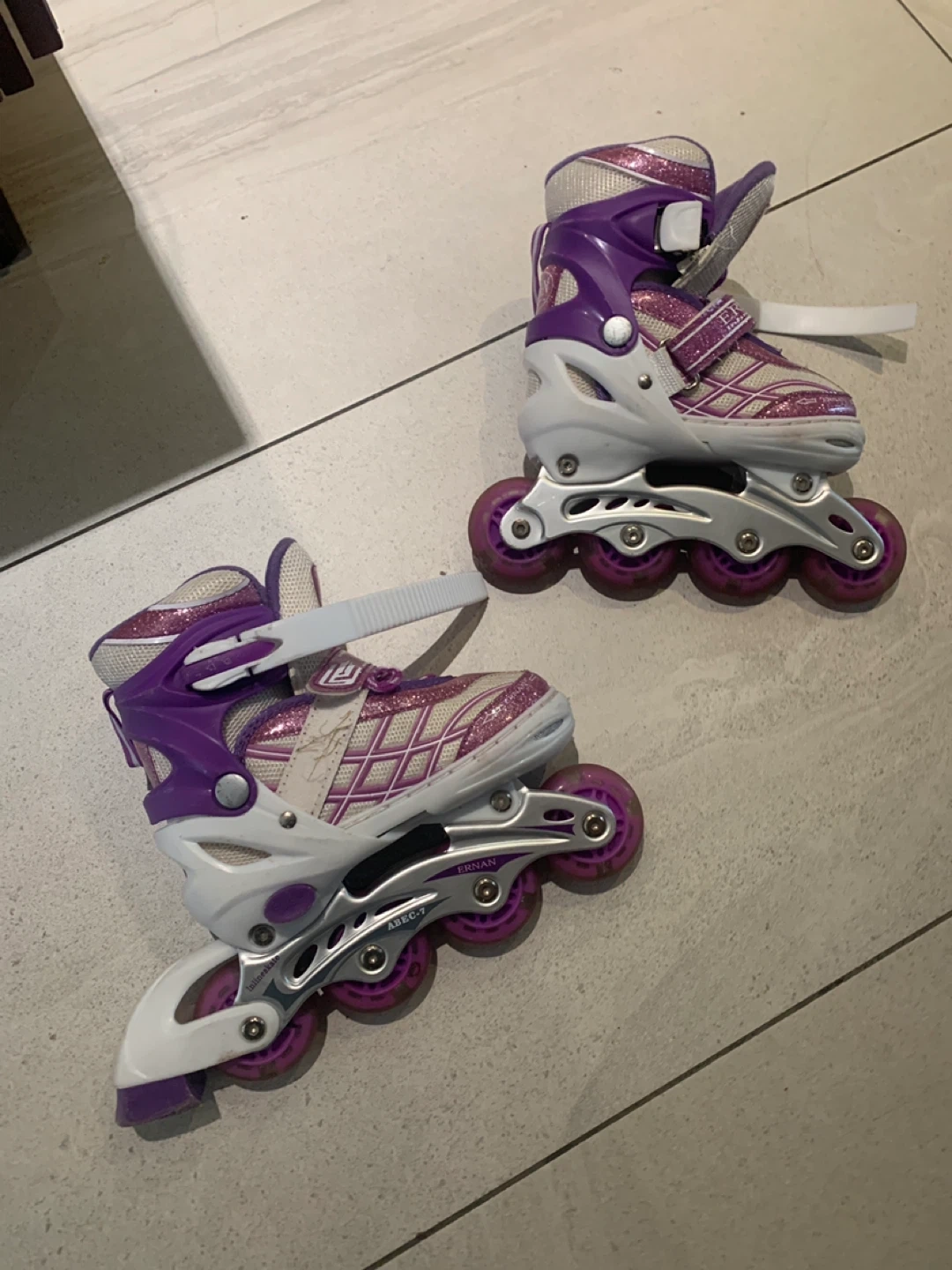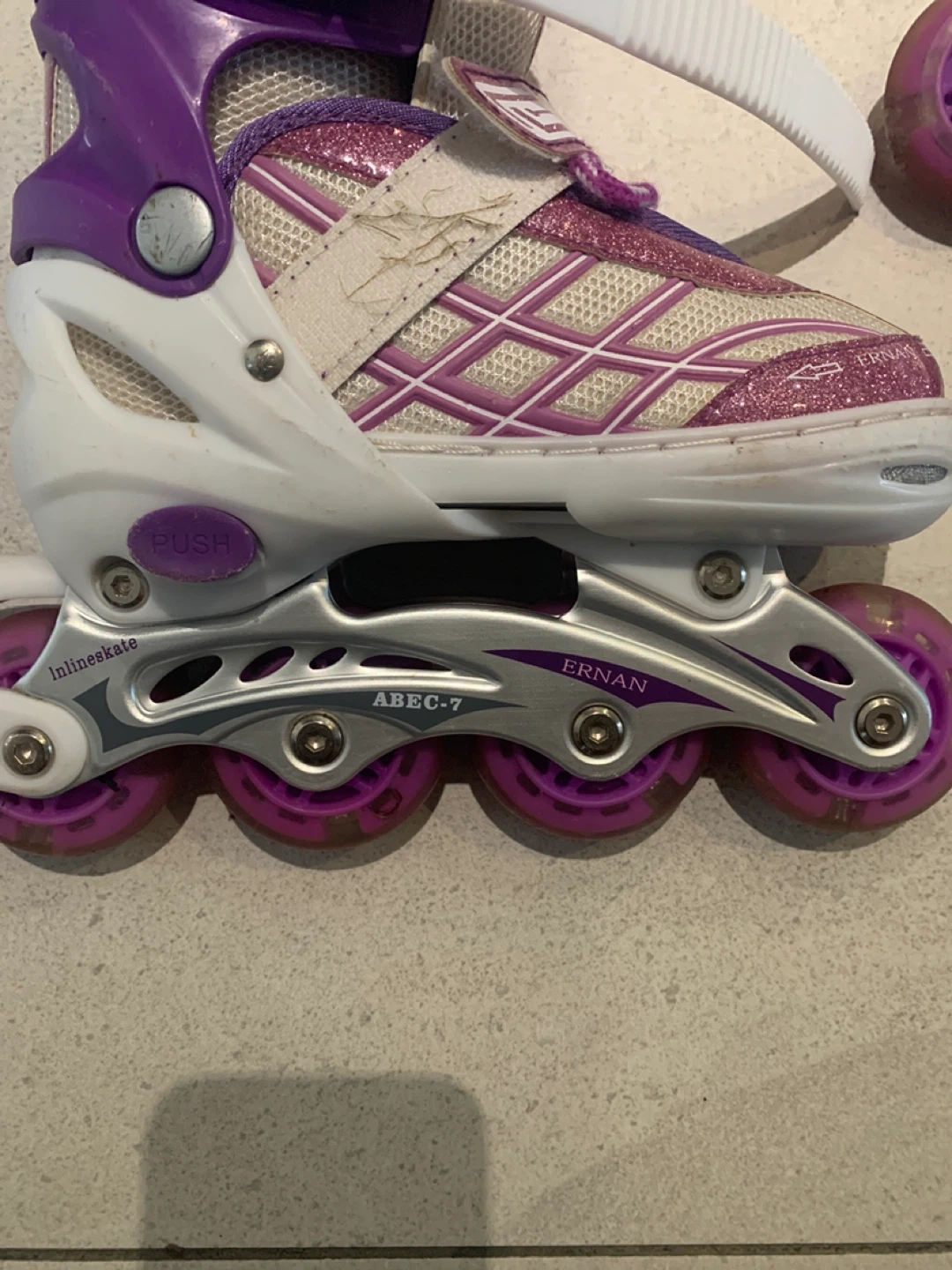 Selling a pair of ERNAN inline skates in purple and white. In good working condition! Great for recreational skating.