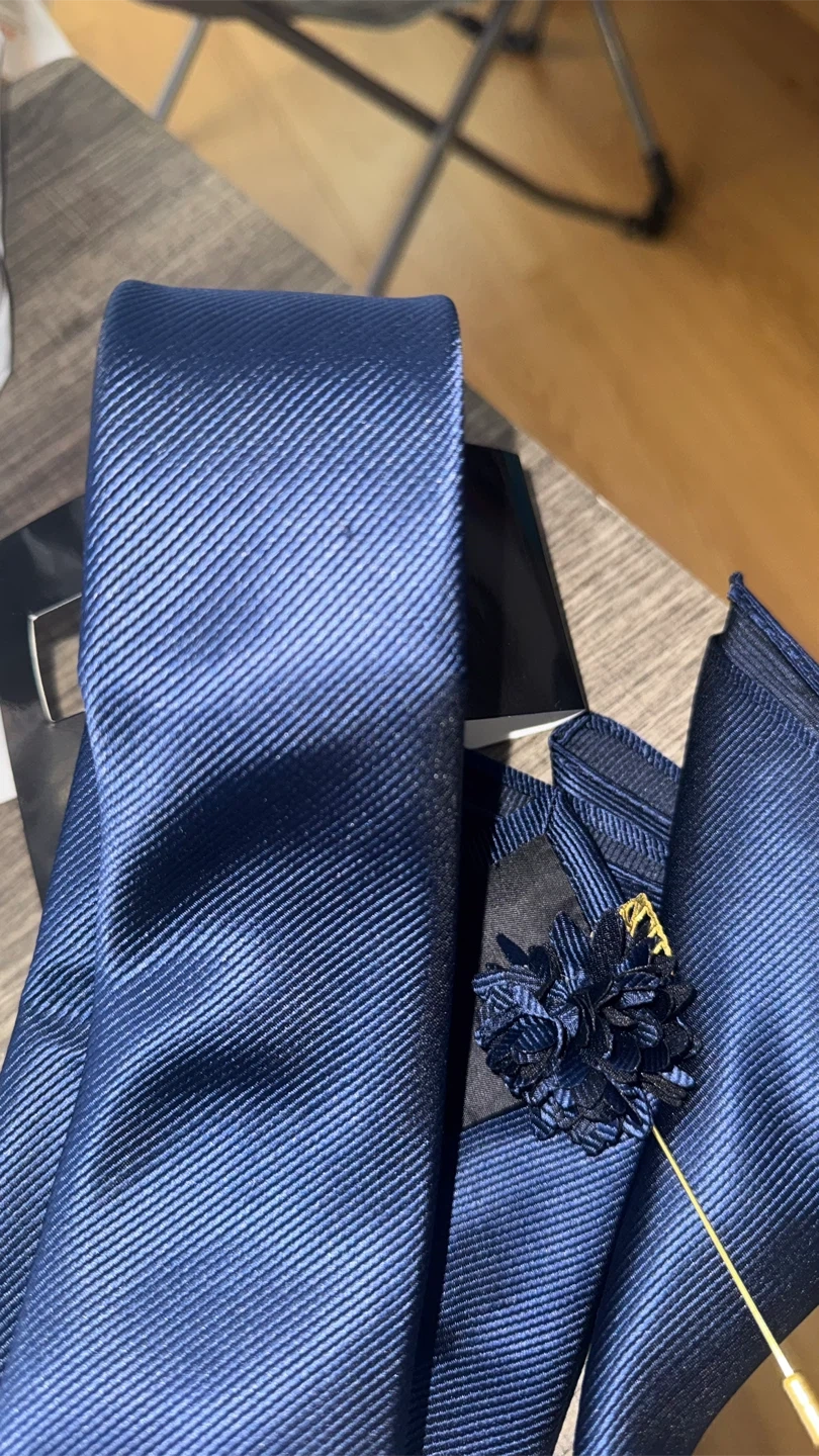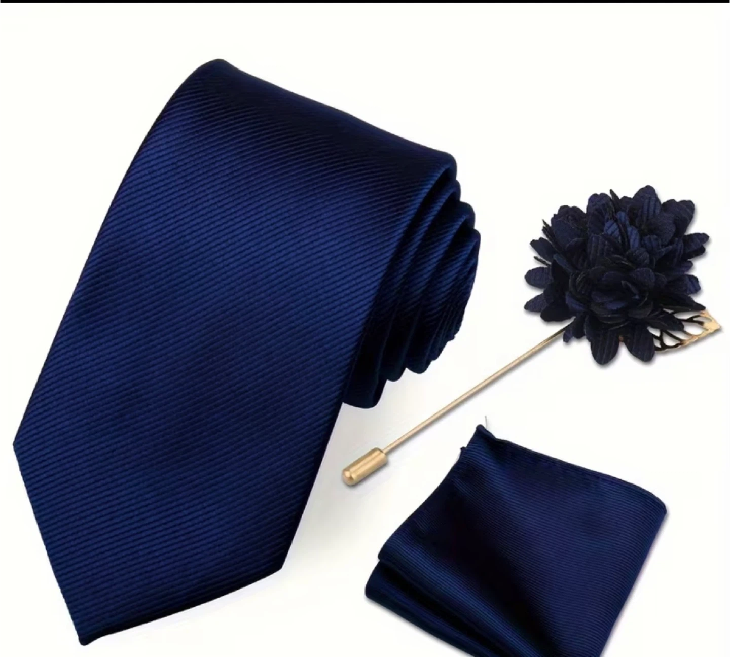 Navy Blue Tie, Pocket Square, and Lapel Pin Set