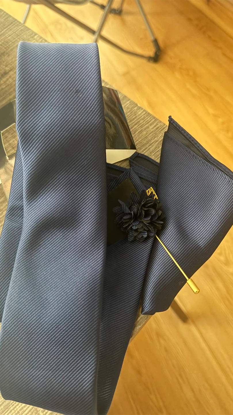 Navy Blue Tie, Pocket Square, and Lapel Pin Set