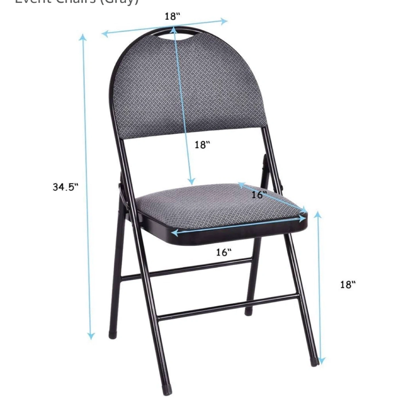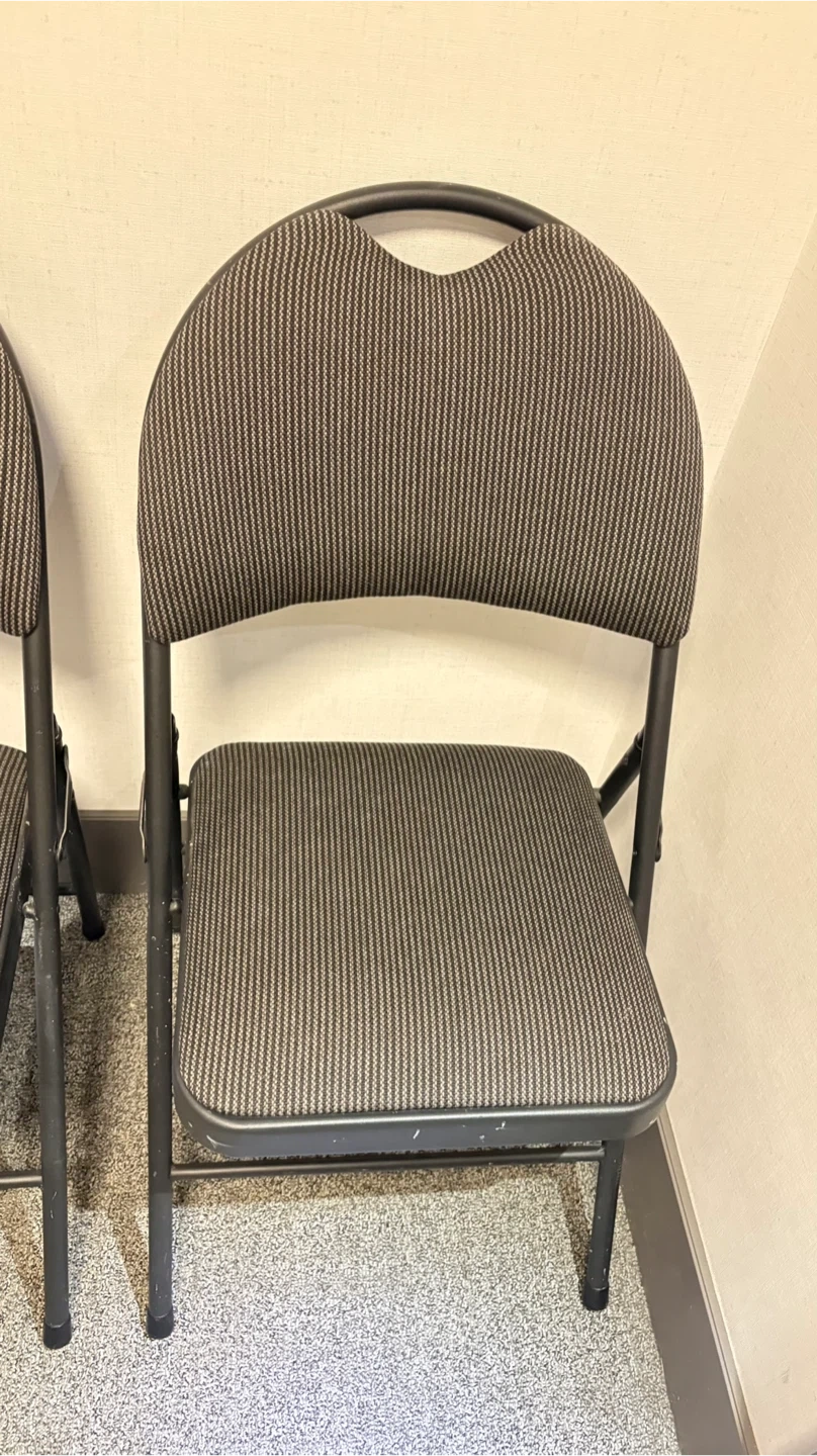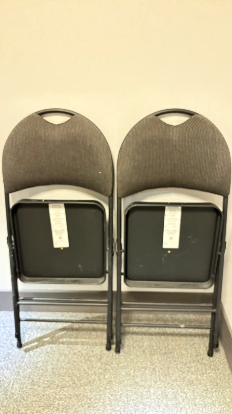 Selling a set of two folding chairs. They're in good condition and perfect for extra seating when you have guests or for events. The chairs have a sturdy metal frame and a comfortable upholstered seat and back. Great for small spaces as they fold up easily for storage!