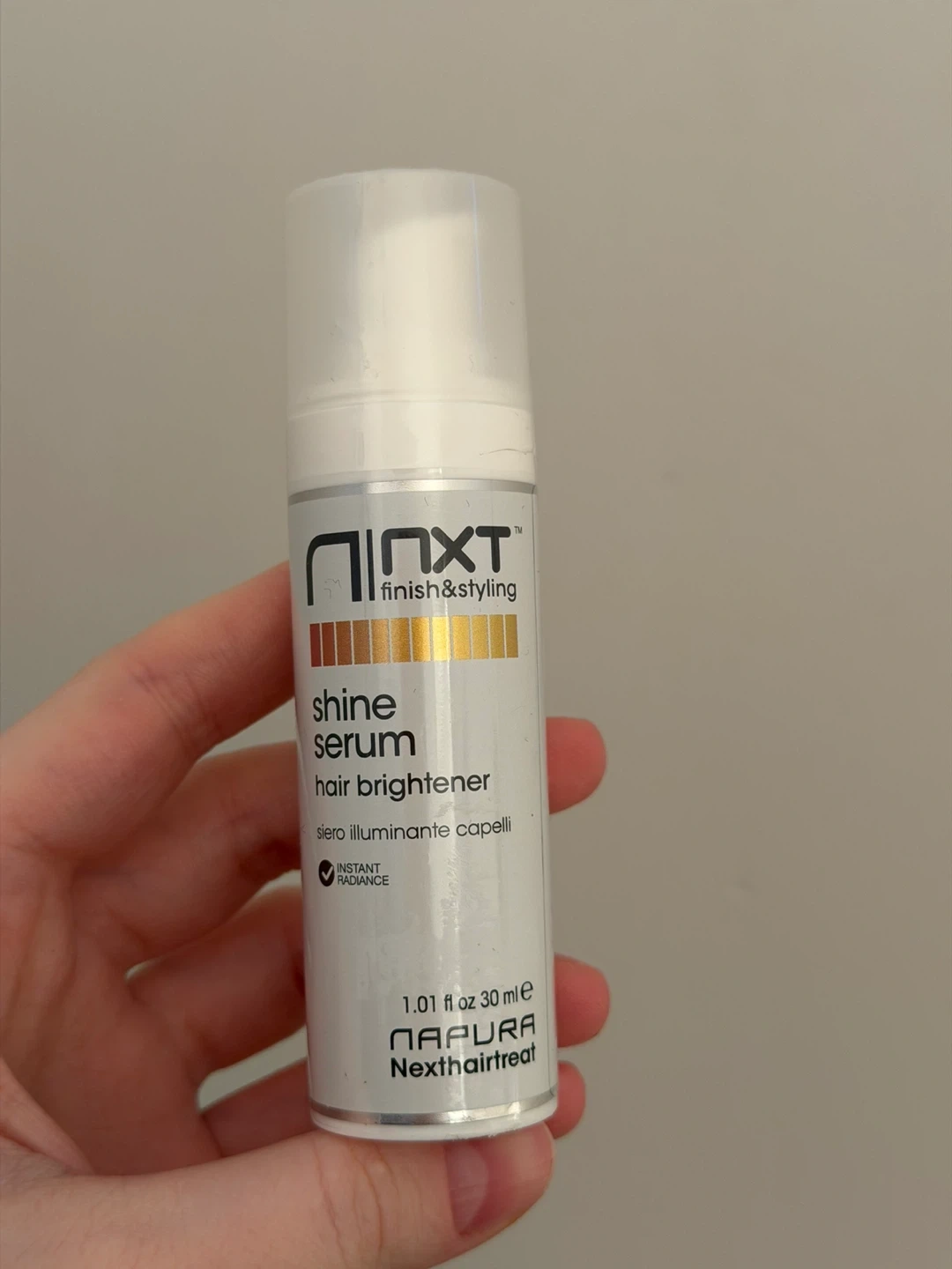 This is Napura NXT shine serum for hair brightener. It's a 30ml bottle. Instant radiance for your hair!