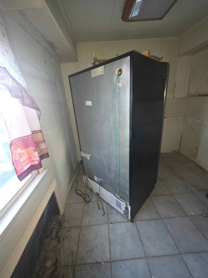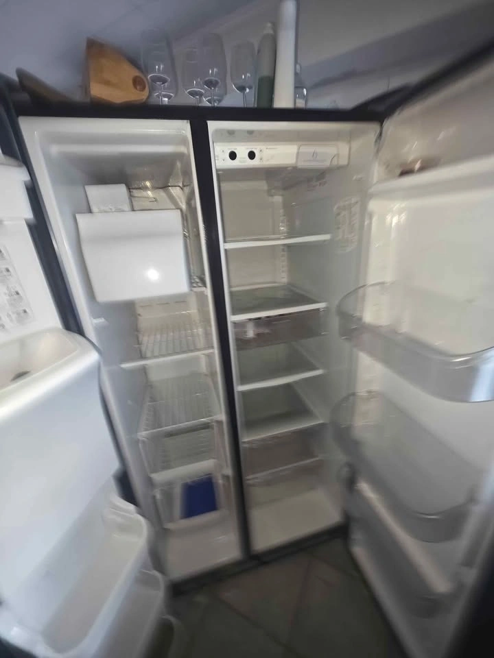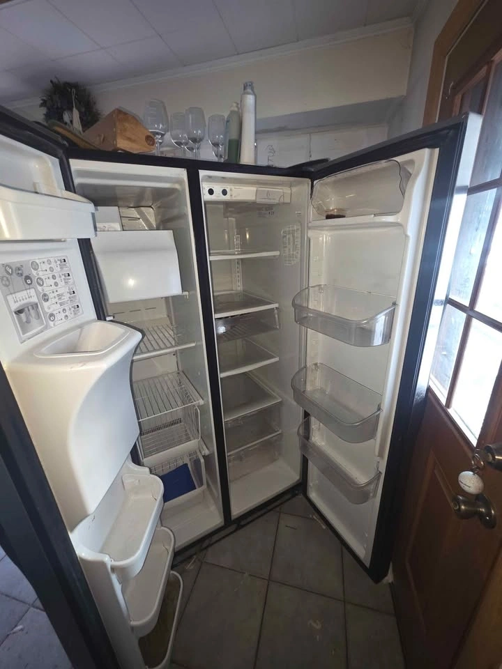 Functional Frigidaire side-by-side refrigerator with a stainless steel finish and a built-in ice and water dispenser. Plenty of shelves and door bins inside for storage. Needs to go!