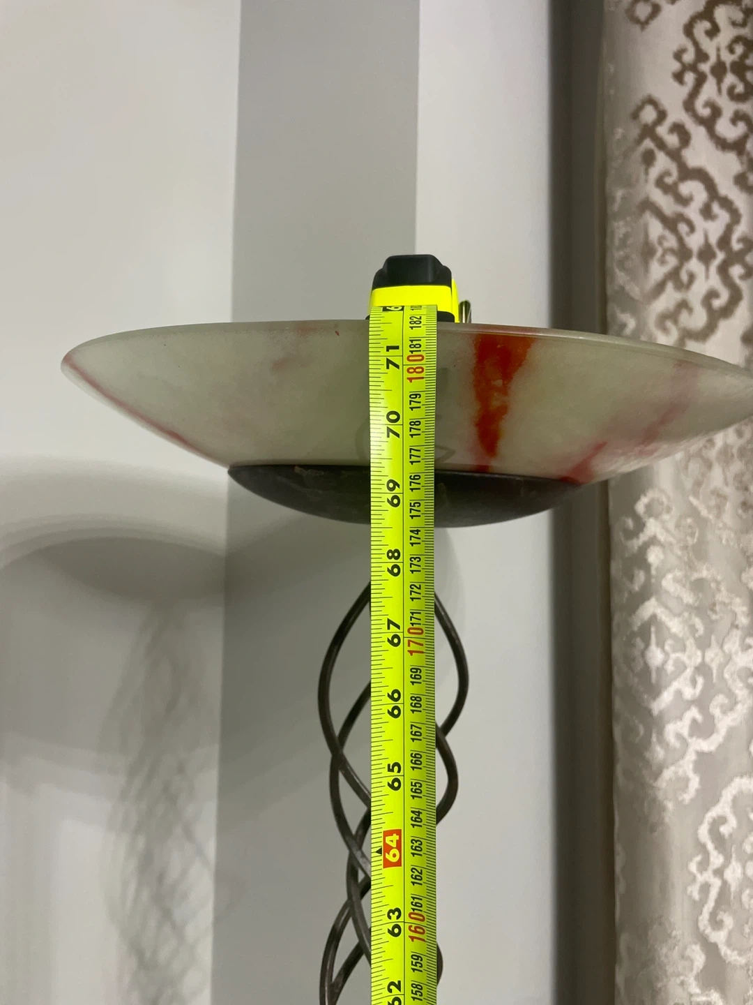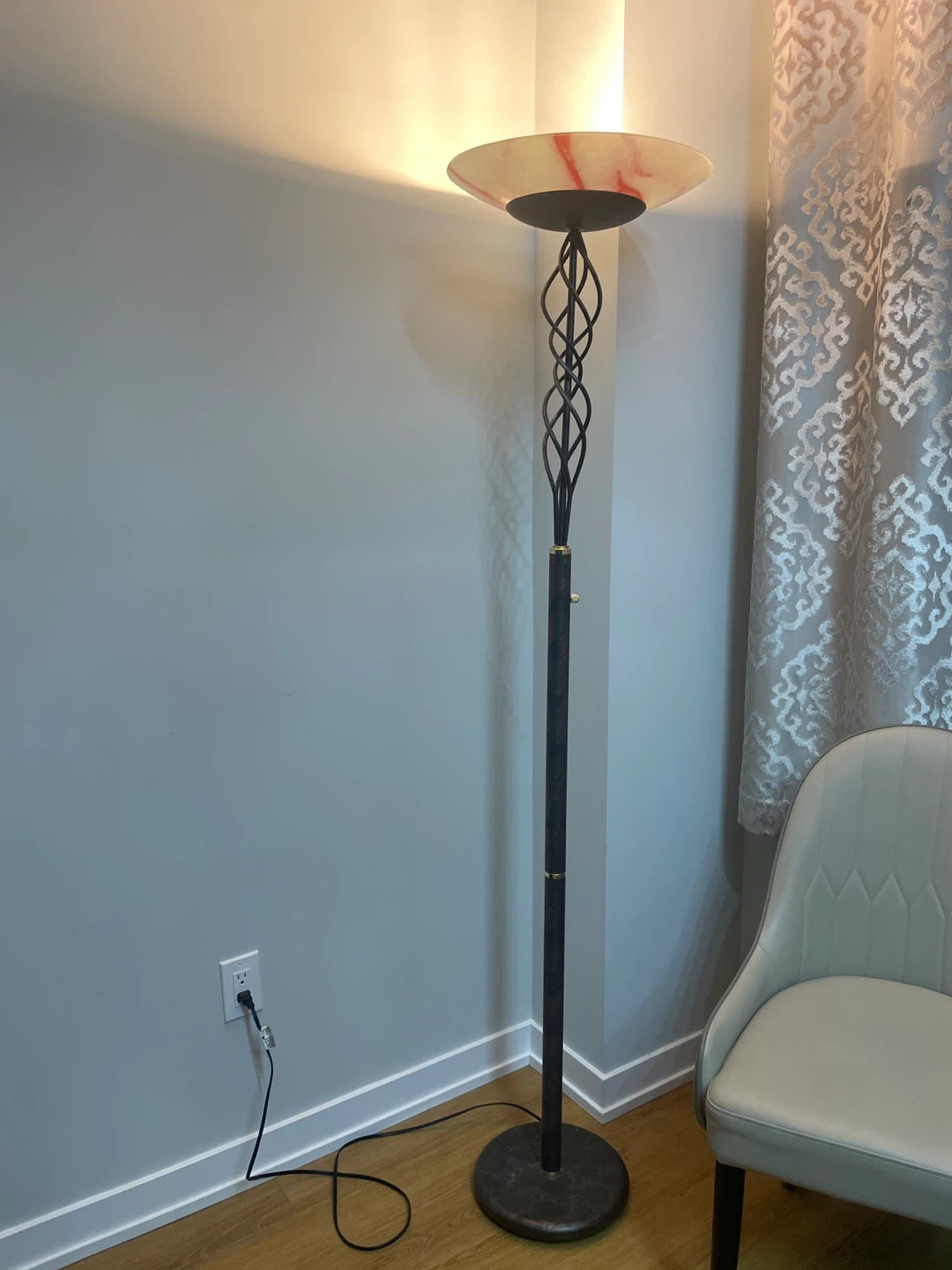 This vintage floor lamp has a unique twisted metal design and an alabaster-style shade with red veining. The base is dark with a marbled effect. It stands approximately 70 inches tall. Adds a touch of elegance to any room!