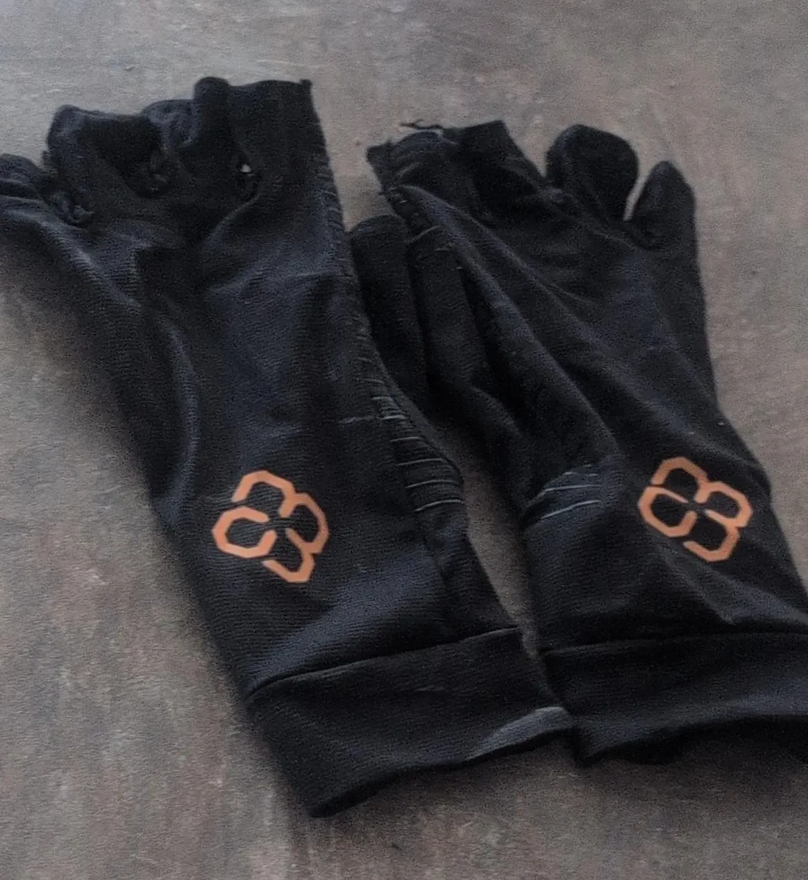 Pair of black cycling gloves featuring an orange logo. These gloves are made of a flexible material. They're great for cycling or other outdoor activities. The material feels soft and durable.