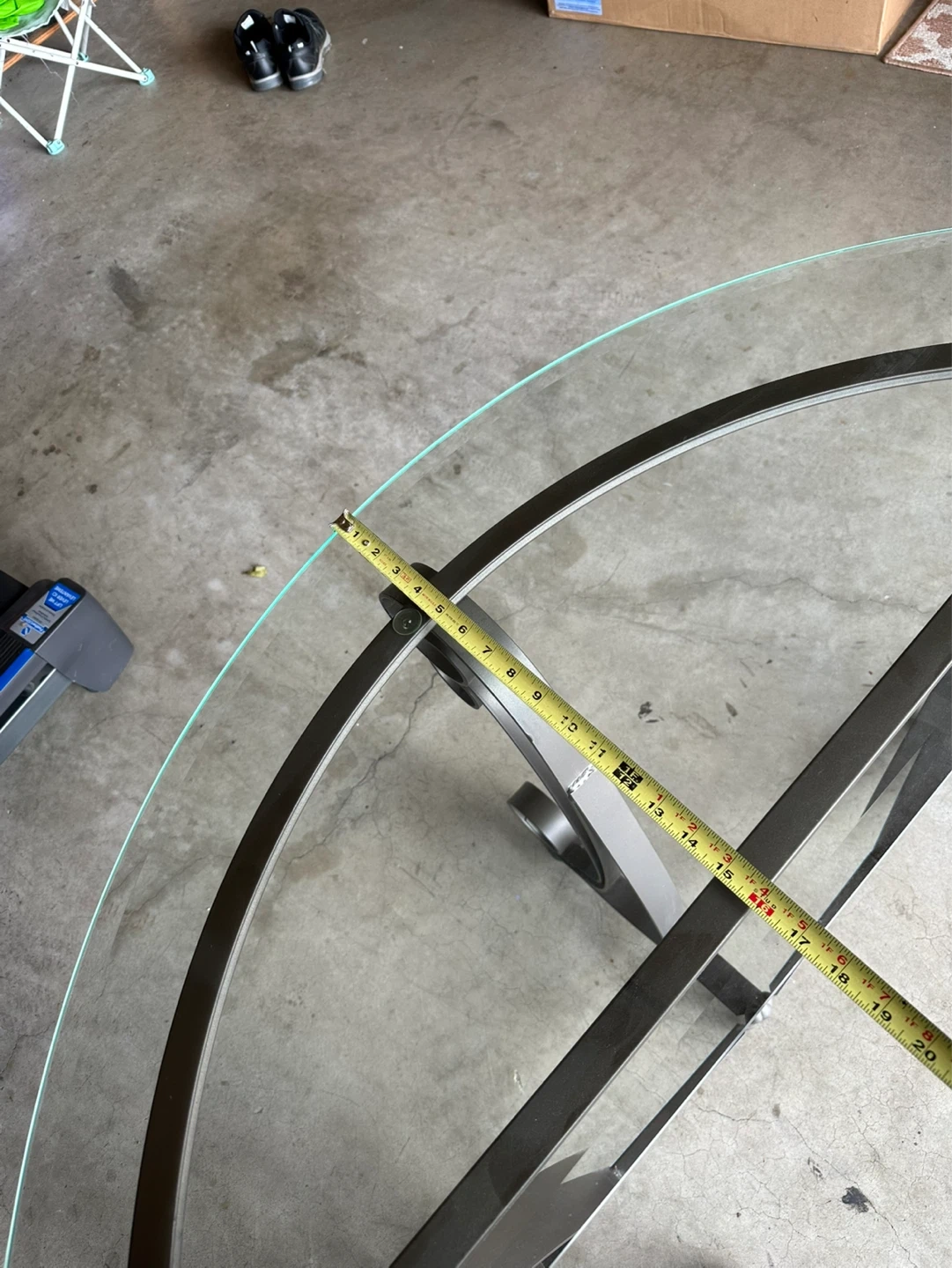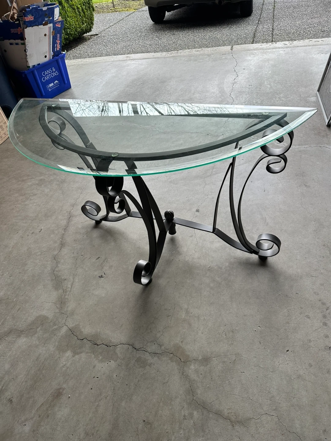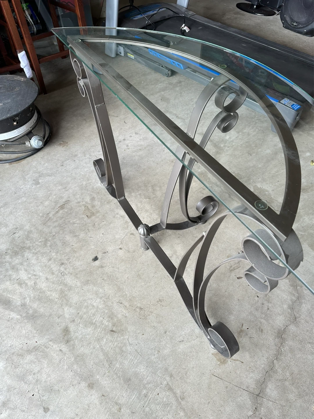 A semicircular console table with a glass top and ornate metal base. It's approximately 30 inches tall and 15 inches deep. This table would fit nicely in an entryway or hallway.