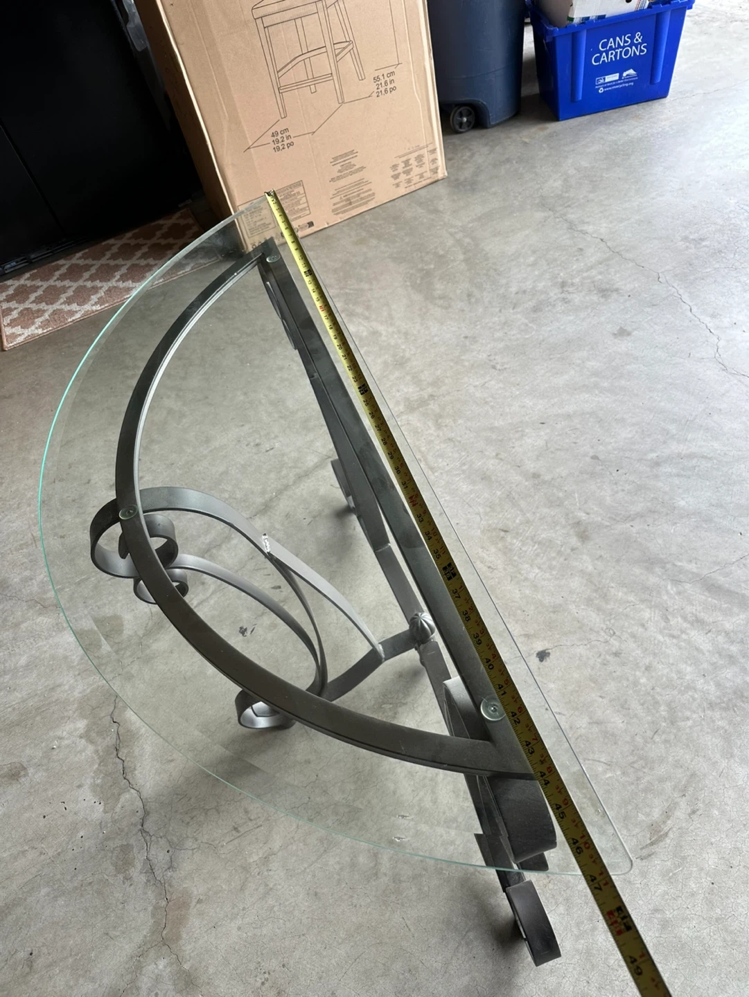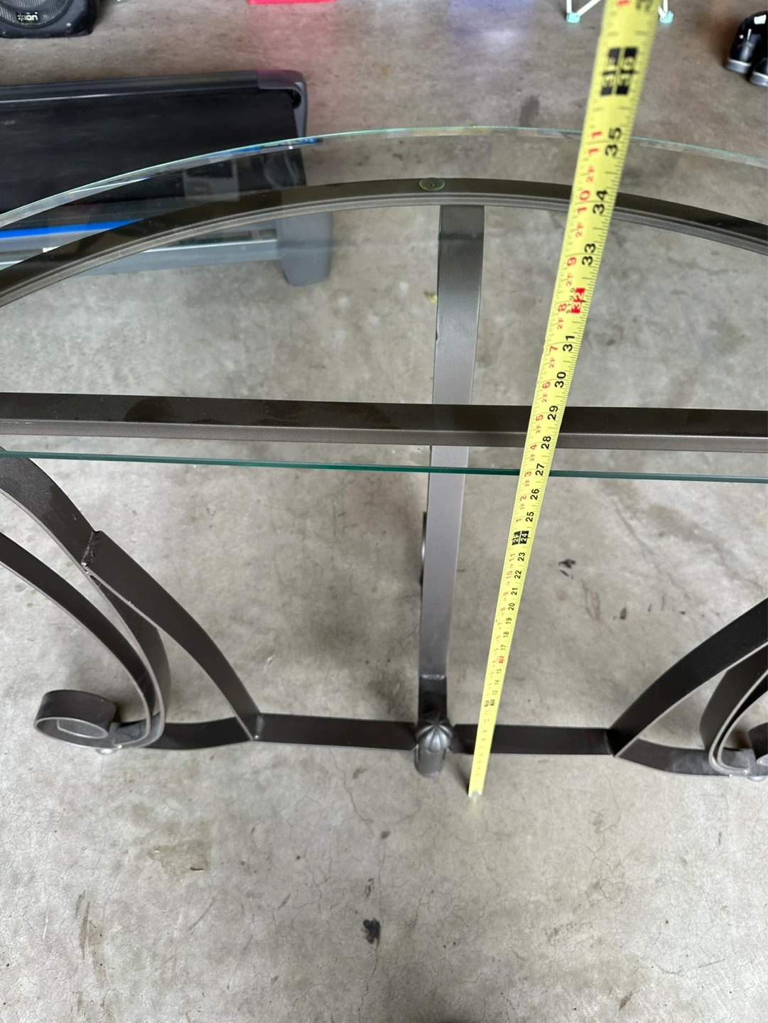 A semicircular console table with a glass top and ornate metal base. It's approximately 30 inches tall and 15 inches deep. This table would fit nicely in an entryway or hallway.