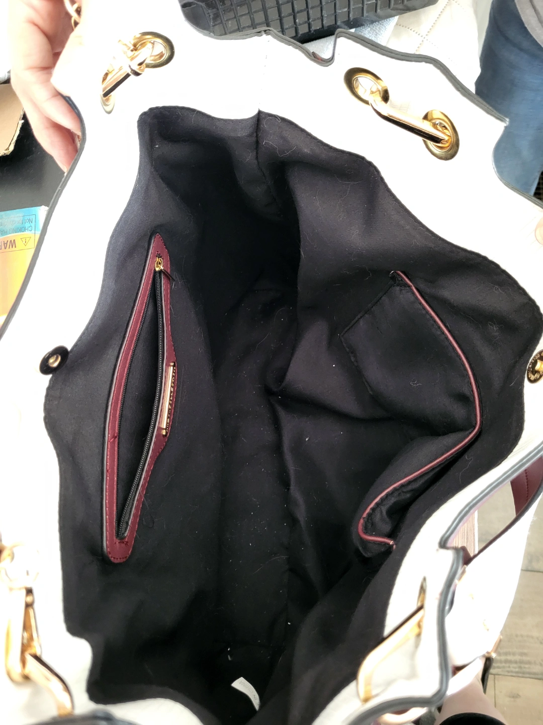 Large tote bag. Two-toned burgundy and off-white. Gold-tone hardware. Detachable shoulder strap. Several compartments. Zipper closures. never used.