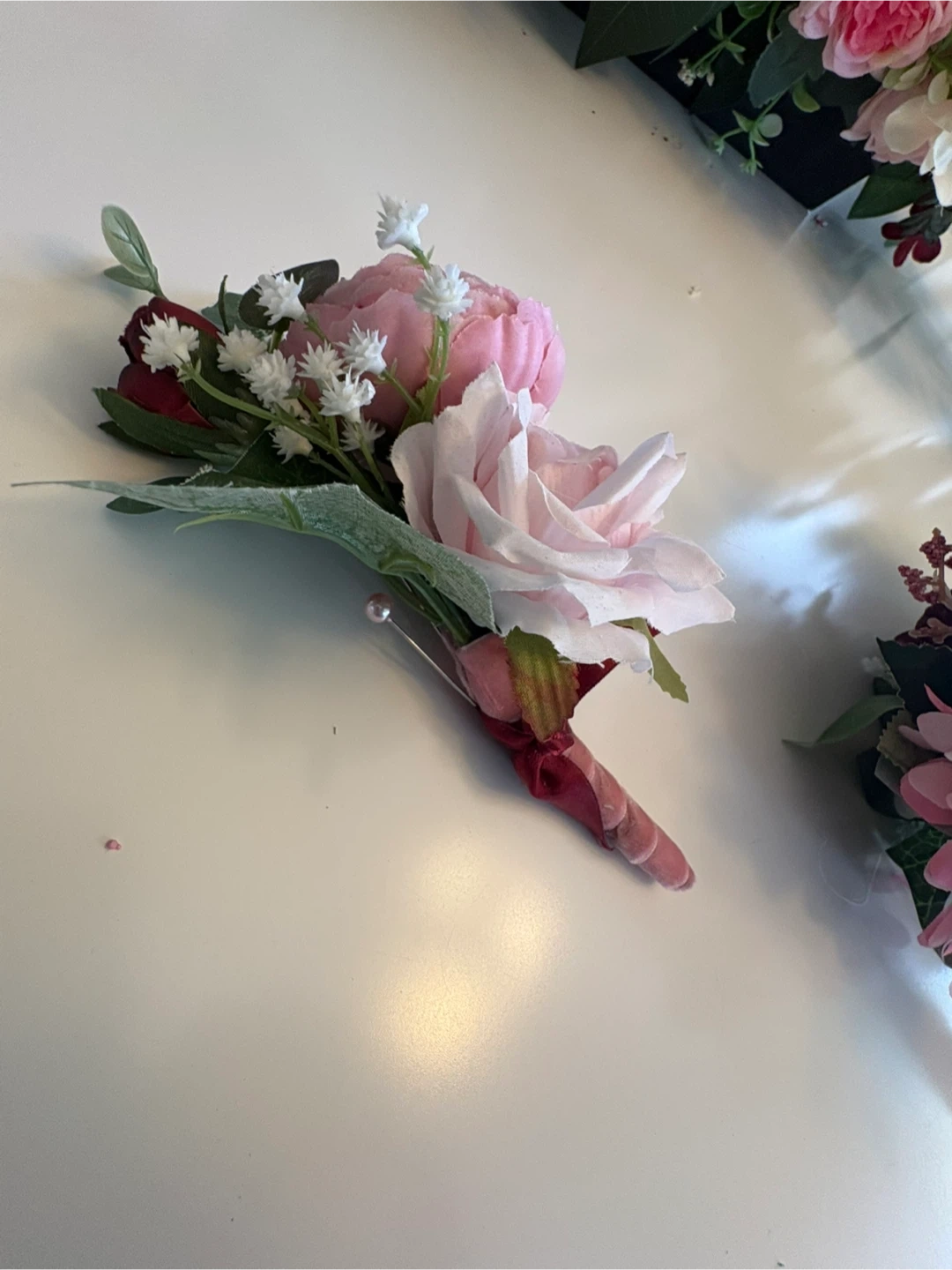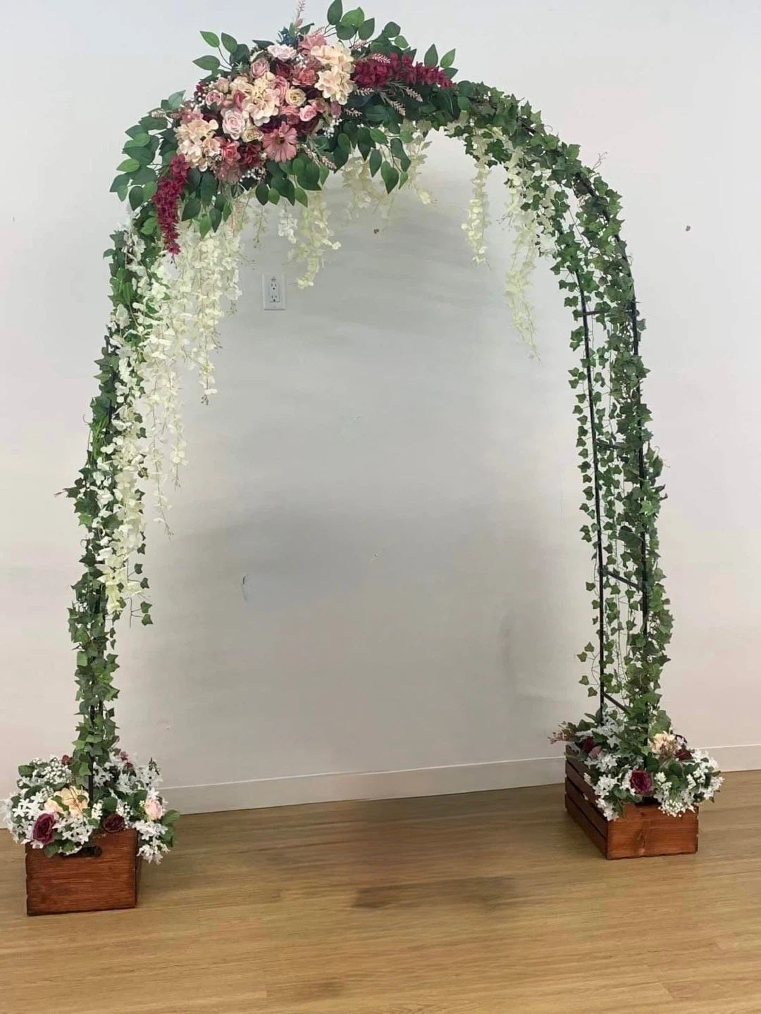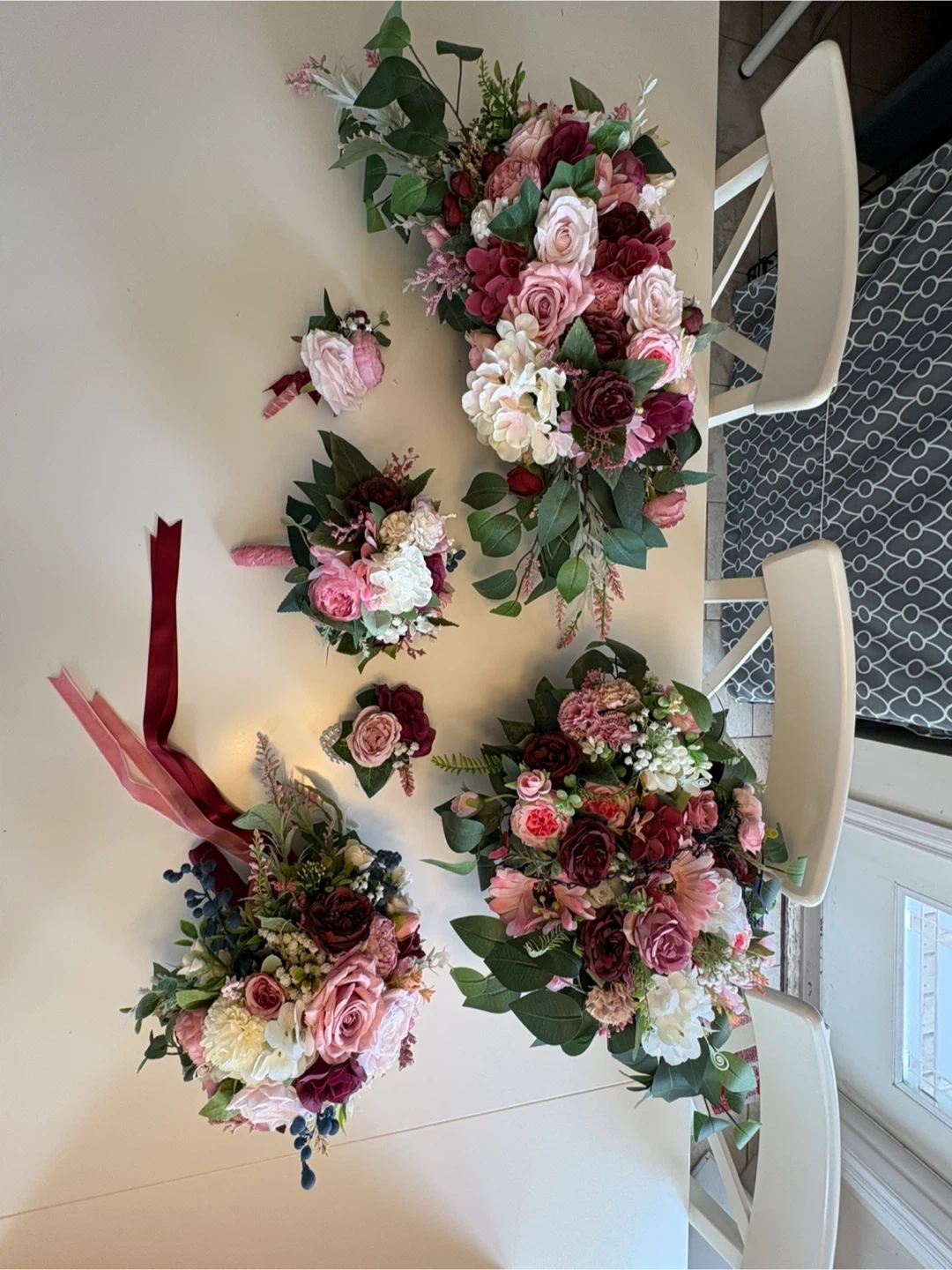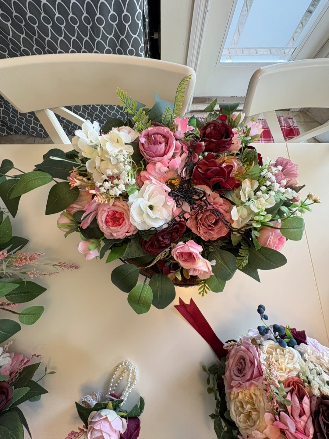 This beautiful set of artificial wedding flowers includes an arch, table centrepiece, bouquets and boutonnieres in shades of burgundy, pink, and cream. They feature roses, hydrangeas, and greenery, accented with velvet ribbons and faux berries. This arrangement is perfect for a wedding ceremony or reception decor.