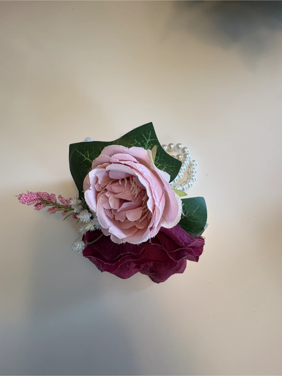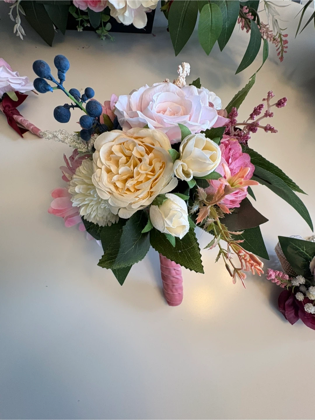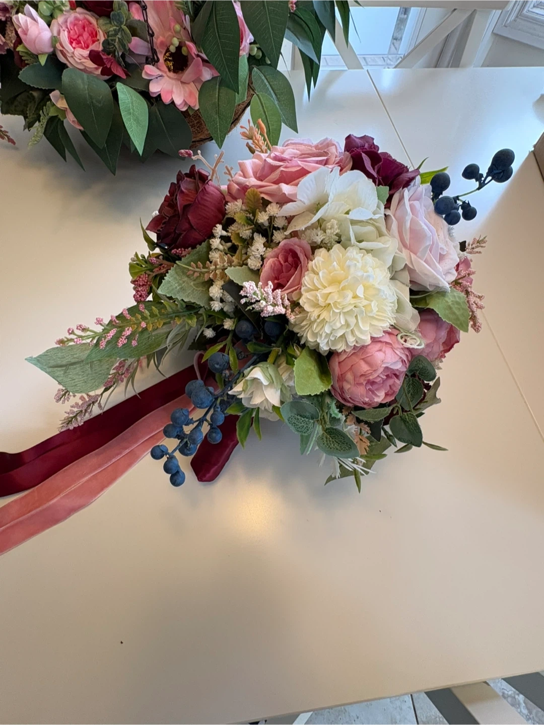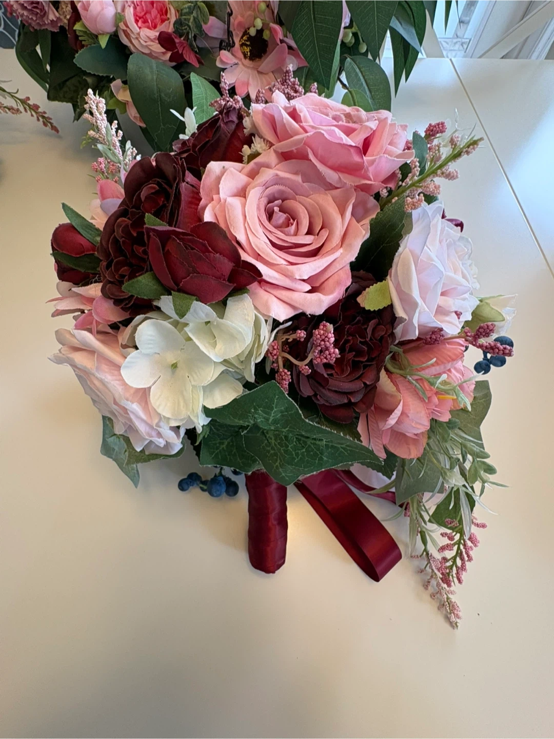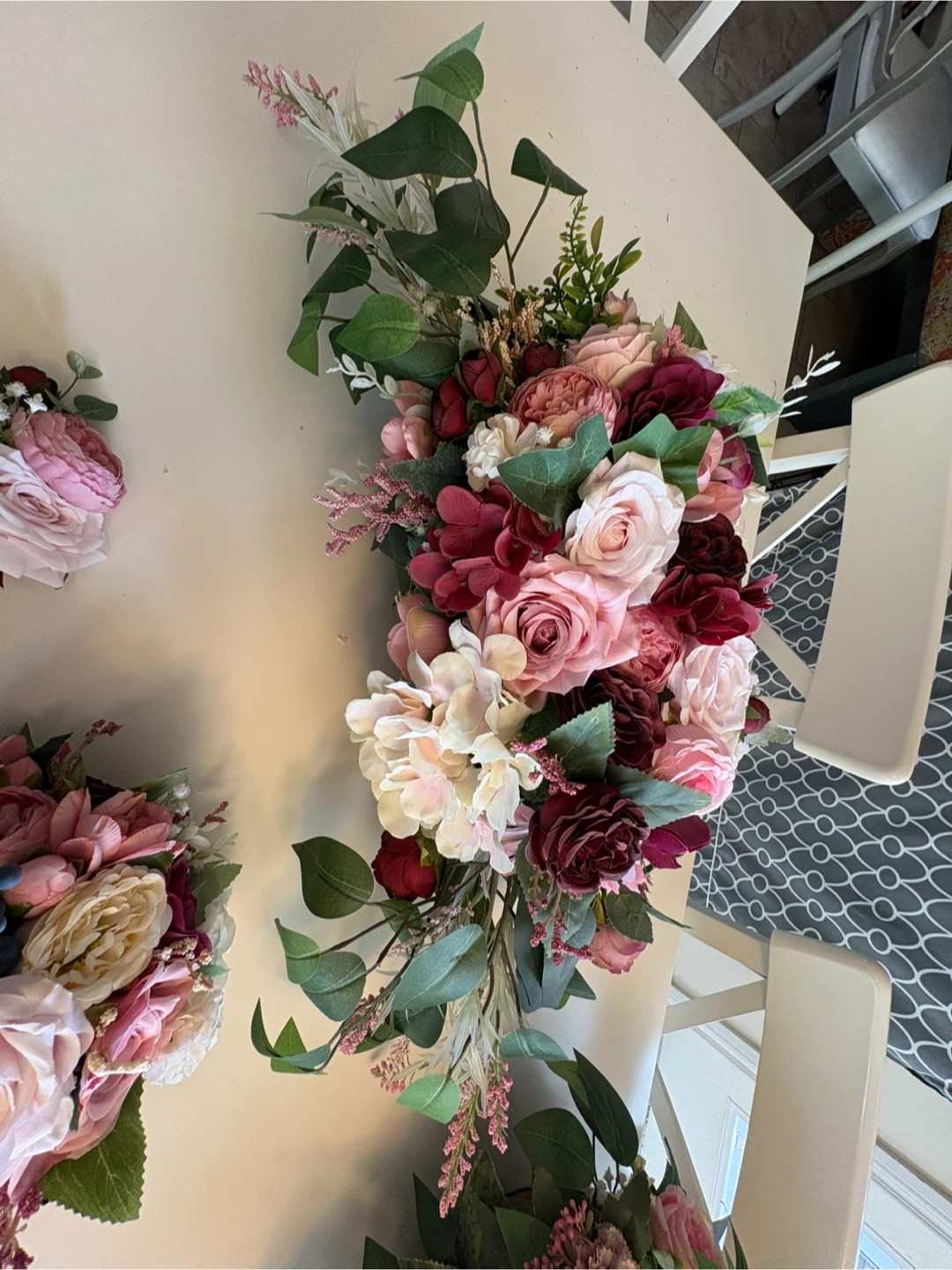 This beautiful set of artificial wedding flowers includes an arch, table centrepiece, bouquets and boutonnieres in shades of burgundy, pink, and cream. They feature roses, hydrangeas, and greenery, accented with velvet ribbons and faux berries. This arrangement is perfect for a wedding ceremony or reception decor.