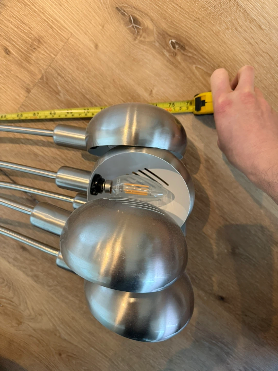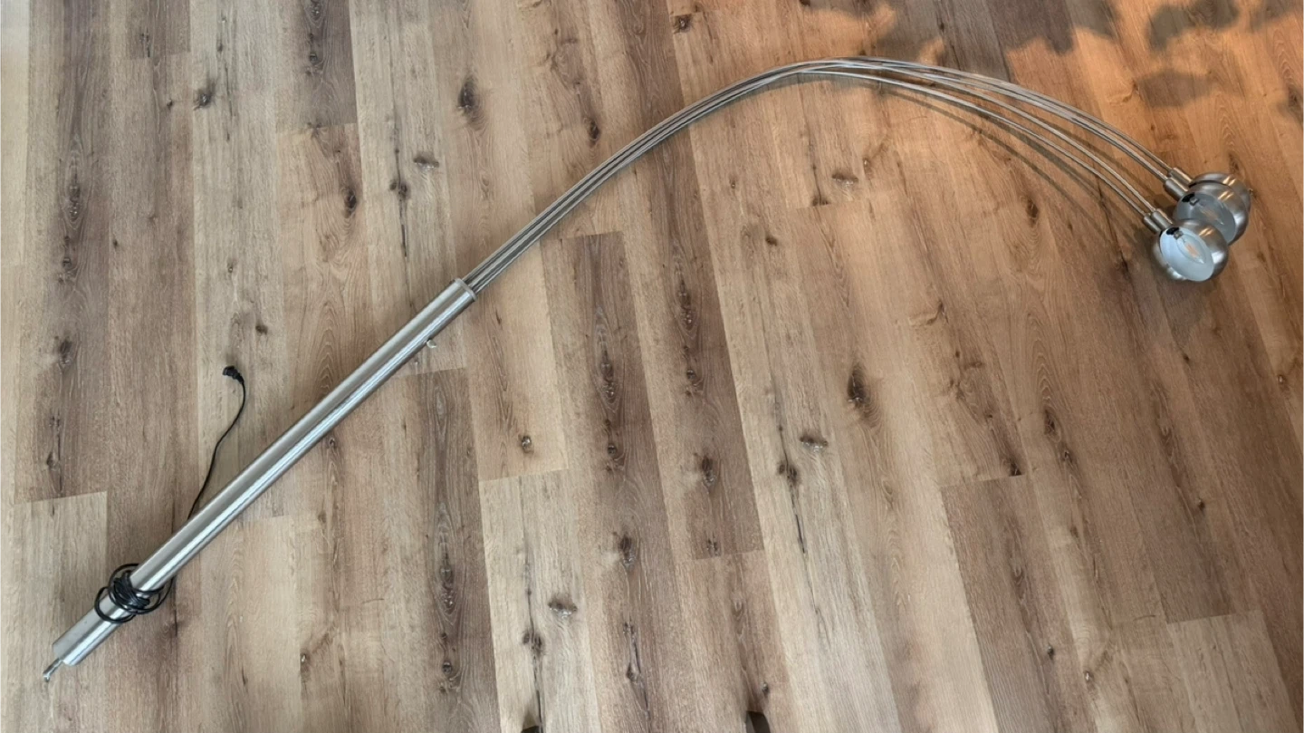 A modern silver floor lamp with five dimmable and adjustable lights. Adjustable, in the sense that they can be spread out, or closer together depending on your space. It's made of metal and has a flexible design. The lamp measures approximately 3 metres long, end-to-end. But only about 2 metres tall otherwise.