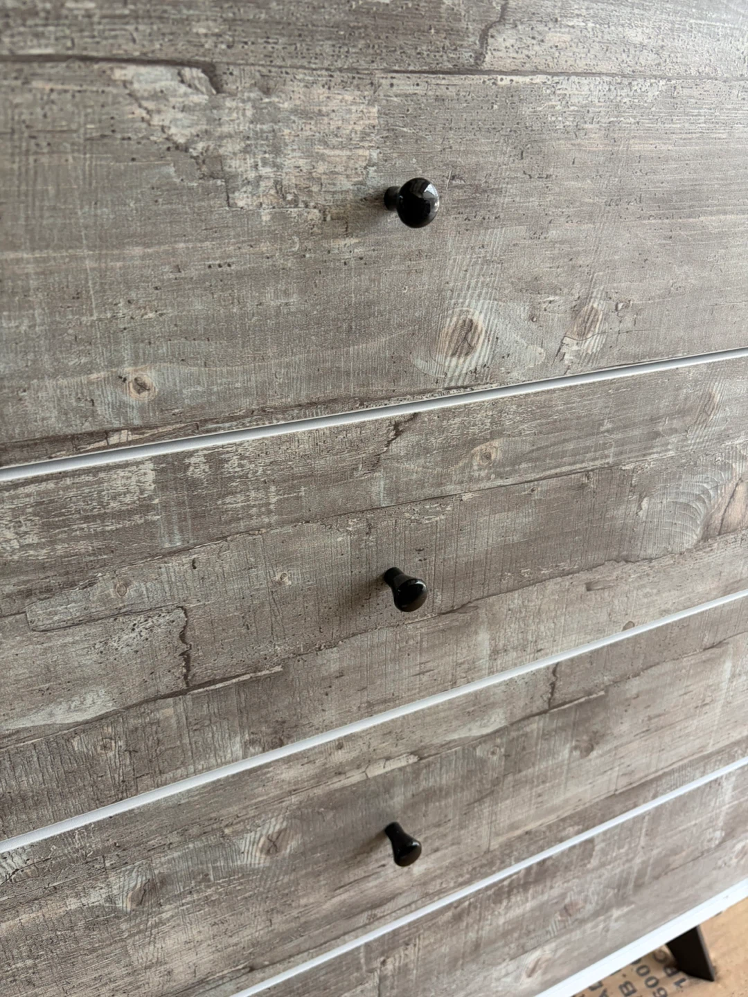 This dresser features a white finish with four drawers that have a rustic faux wood front. Dimensions are 31 1/2" wide, 15 3/8" deep, and 34 1/2" tall. Great for storing clothes or linens. Currently on Wayfair for $245.