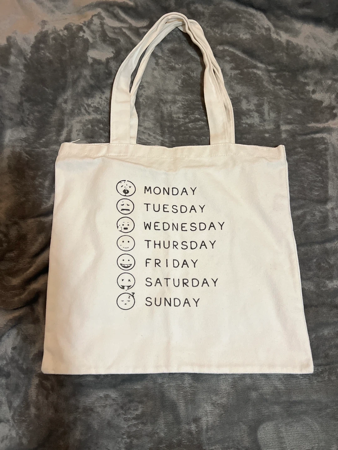 This canvas tote bag features a fun design listing the days of the week with corresponding emojis. It's made of durable canvas material, perfect for everyday use. Shows a different mood for each day!