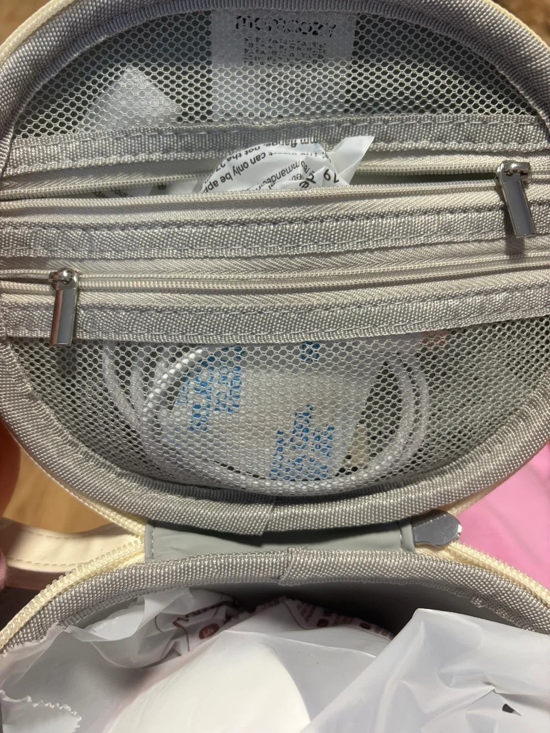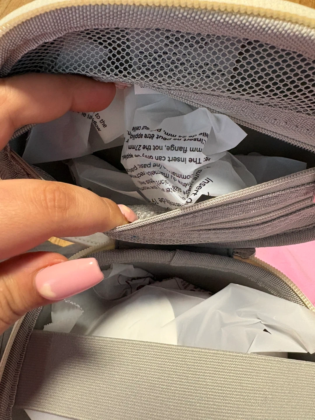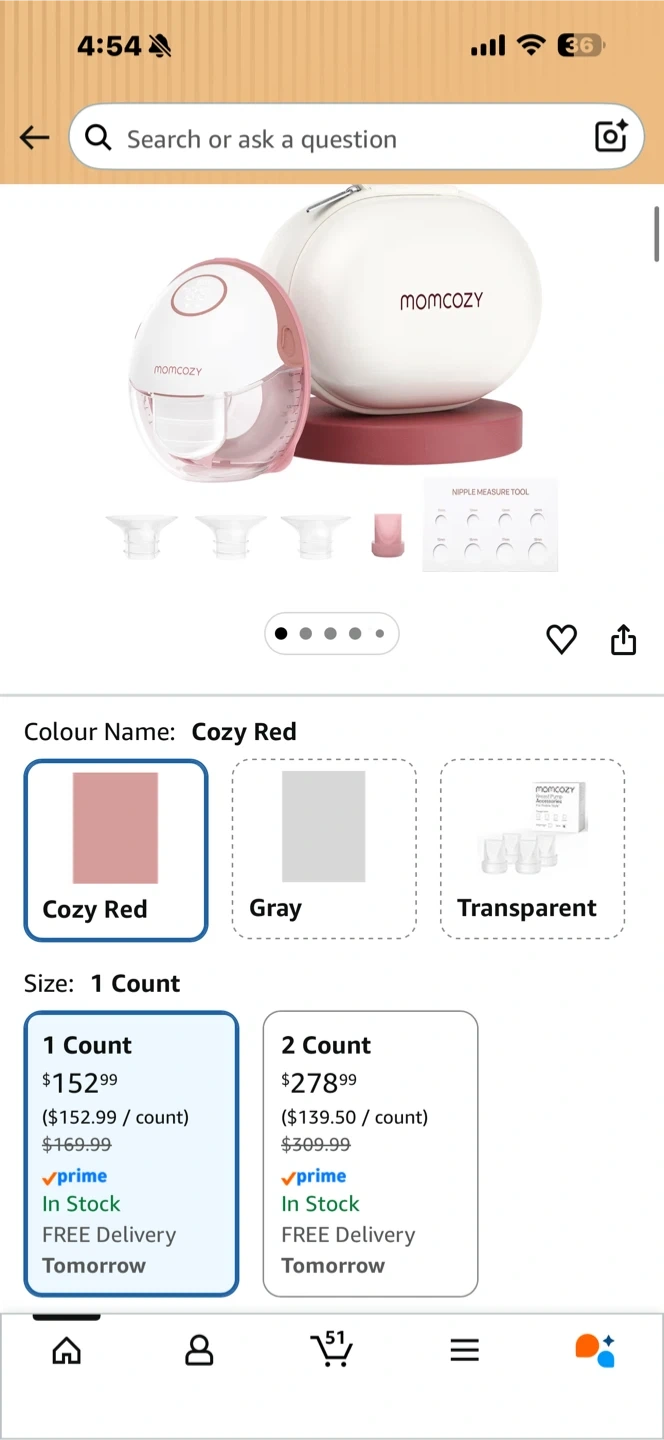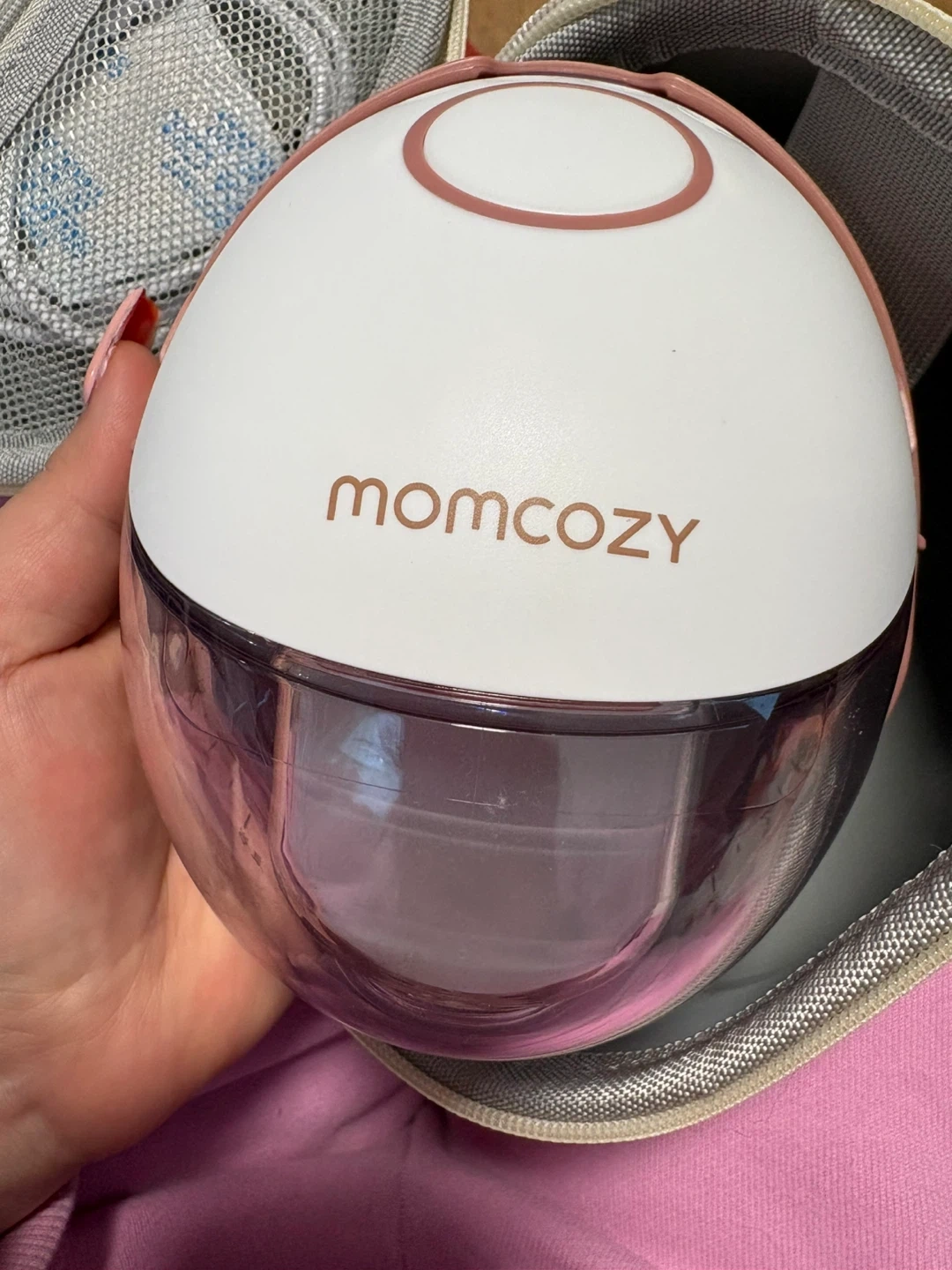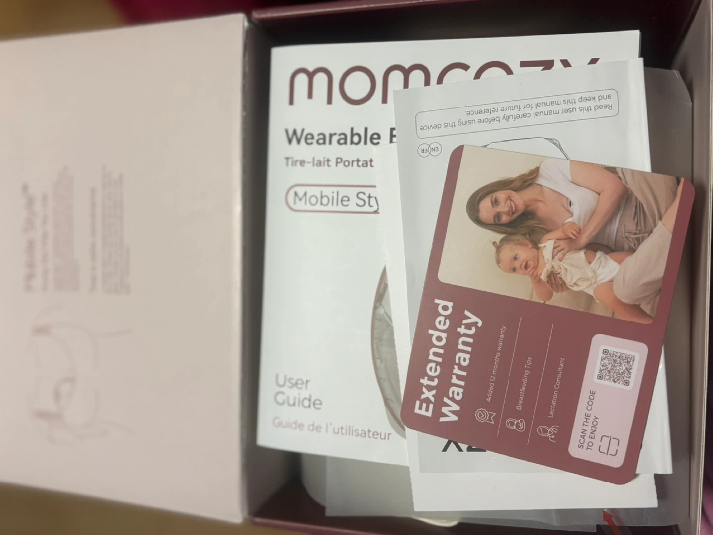 Momcozy wearable electric breast pump in mobile style. It includes the main pump, a user guide, and an extended warranty card. This pump is designed for discreet and convenient use.