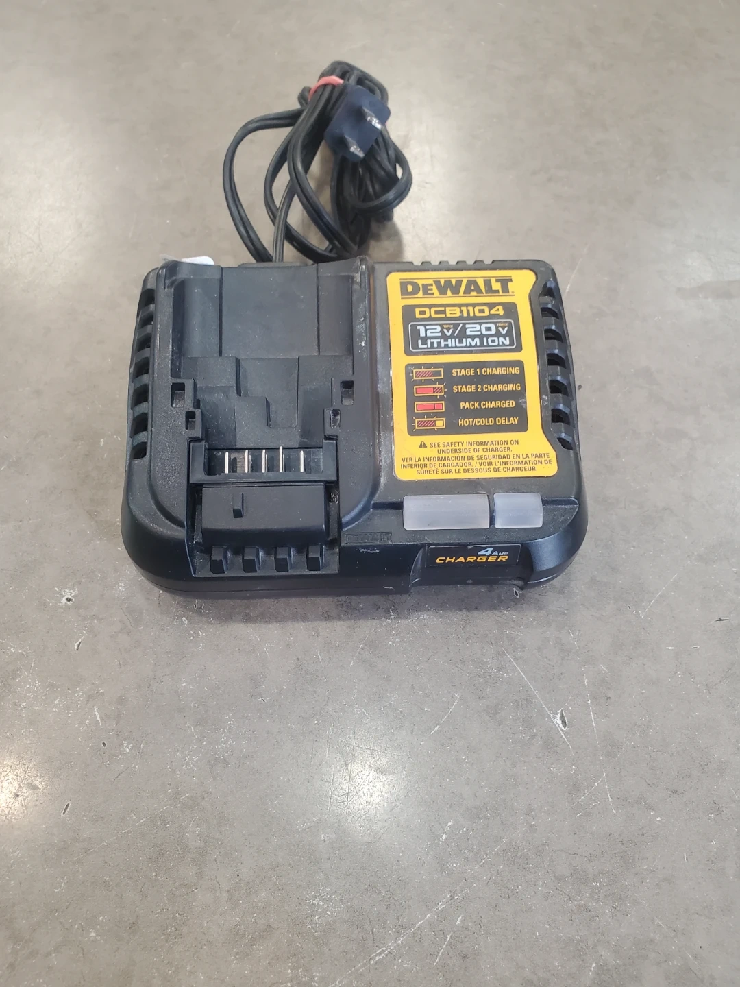DeWalt DCB1104 battery charger for 12V and 20V Lithium Ion batteries. It supports stage 1 charging, stage 2 charging, pack charged, and hot/cold delay. This is a 4 Amp charger.