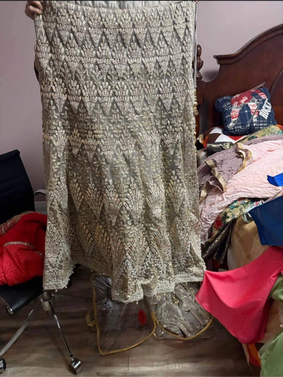 This is a beautiful embroidered lehenga choli set. It features intricate gold and silver thread work on a light grey net fabric. The choli is made of a shimmering silk-like material and is sleeveless. It's perfect for festive occasions and weddings!