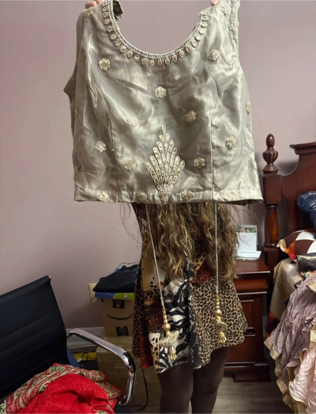 This is a beautiful embroidered lehenga choli set. It features intricate gold and silver thread work on a light grey net fabric. The choli is made of a shimmering silk-like material and is sleeveless. It's perfect for festive occasions and weddings!