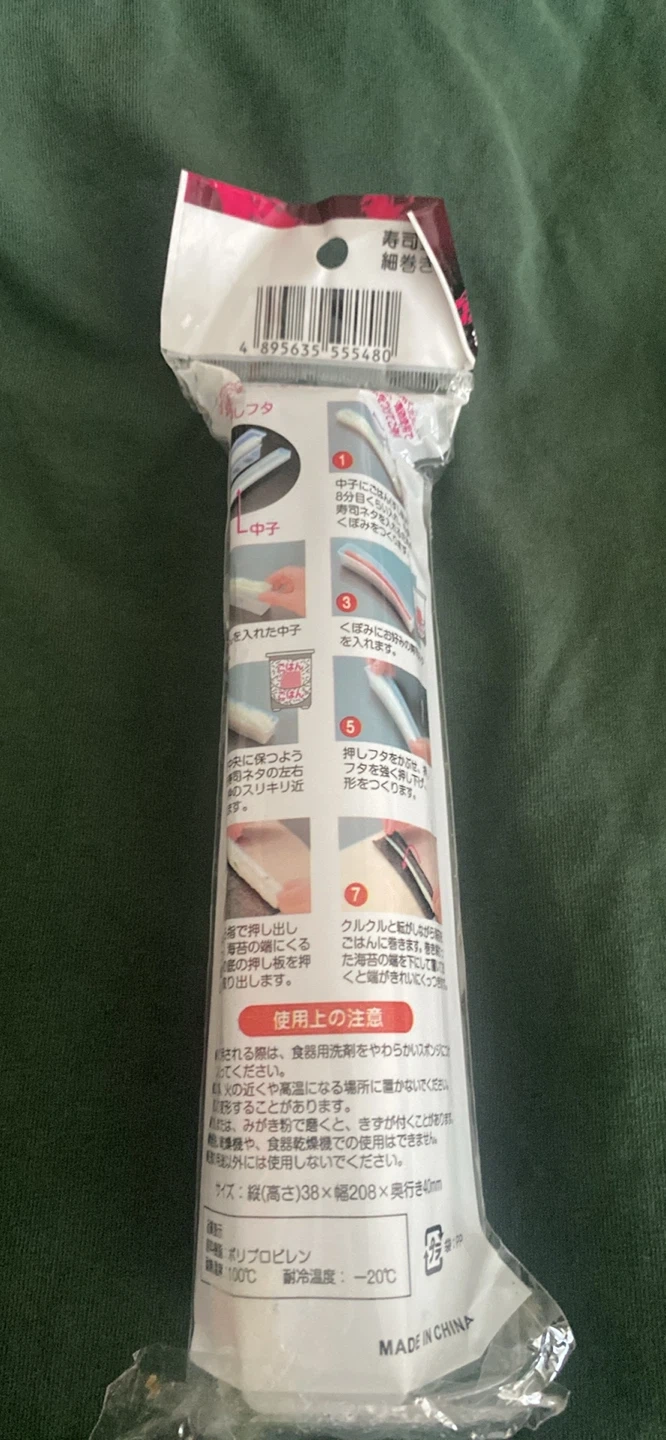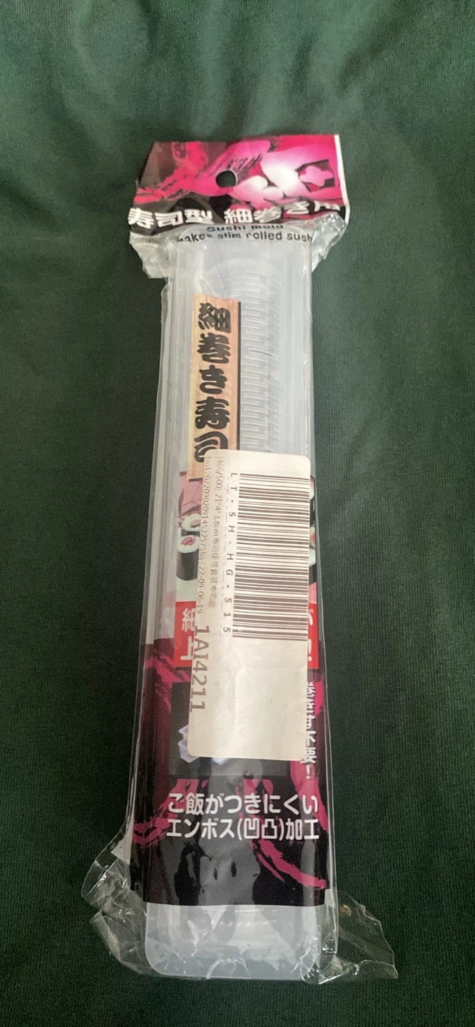 Handy sushi mold for making slim rolled sushi. It is NEW & in package. Made of polypropylene. Heat resistant up to 100°C and cold resistant down to -20°C. Dimensions are about 38mm high, 208mm wide, and 40mm deep. NEVER BEEN USED !