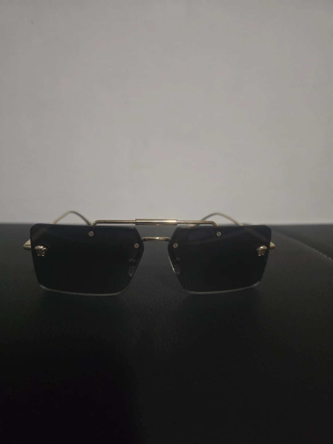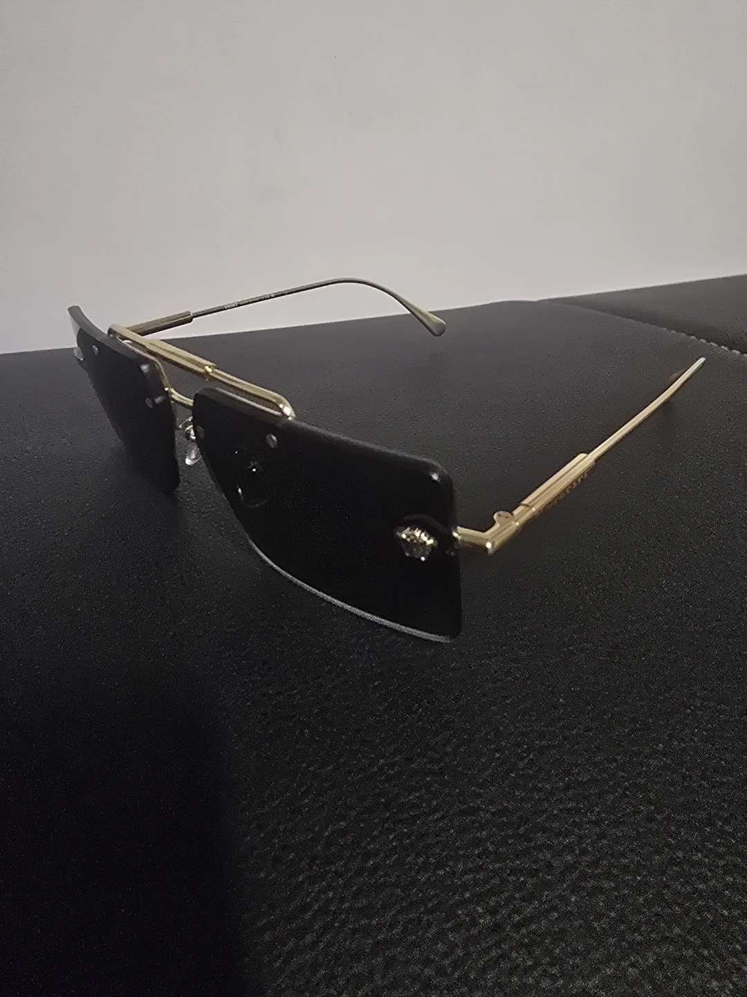 These stylish Versace sunglasses feature a black, rimless design with gold accents. They're a fashionable accessory for any outfit! The lenses offer UV protection.