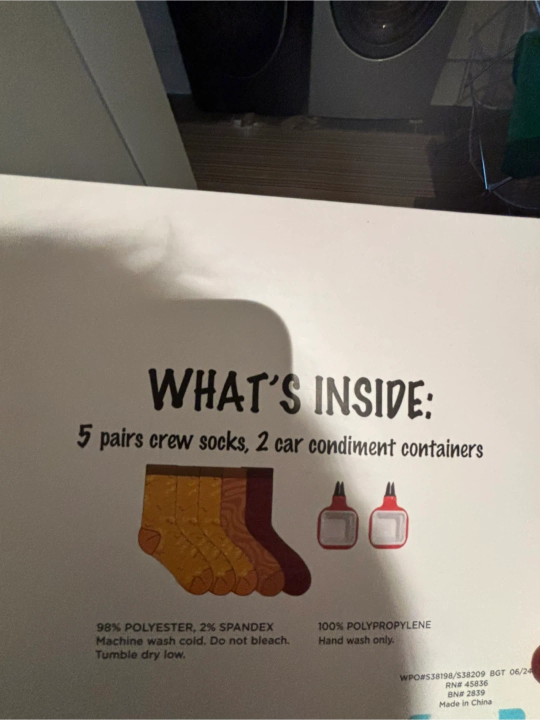 Selling a fun set of Chicken Nugget Socks that includes 5 pairs of crew socks and 2 car condiment containers. The socks are made of 98% polyester and 2% spandex, so they're comfy and easy to care for! The condiment containers are 100% polypropylene and should be hand washed only. A fun gift for the nugget lover in your life!
