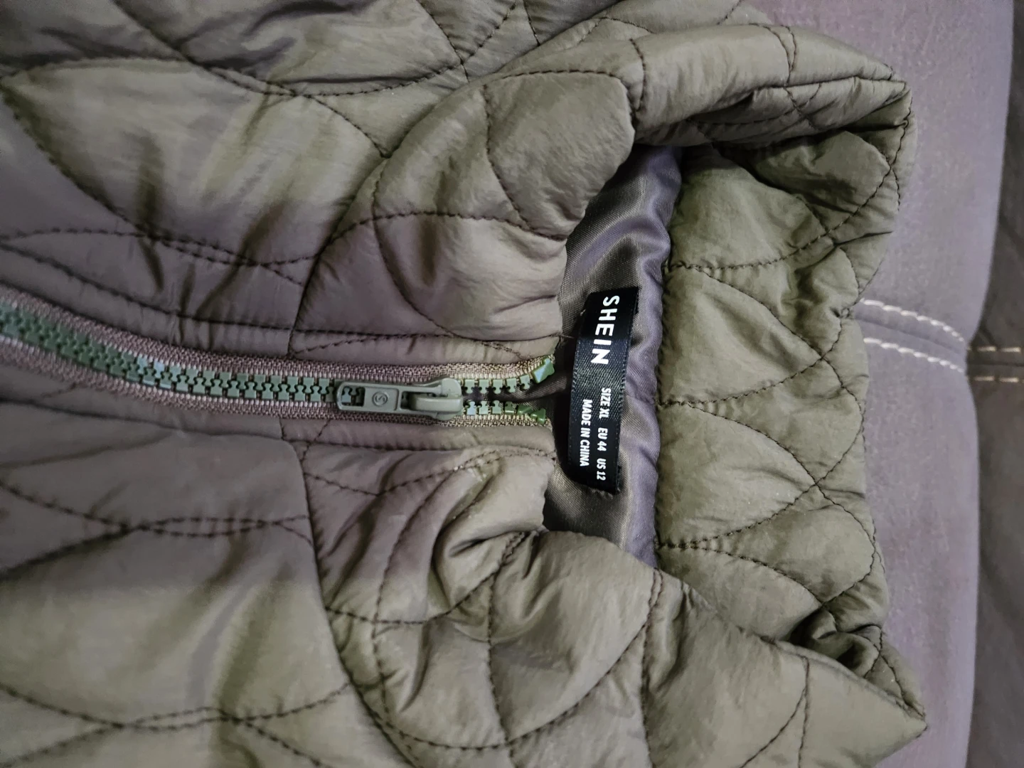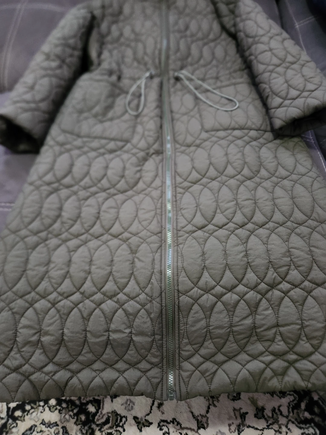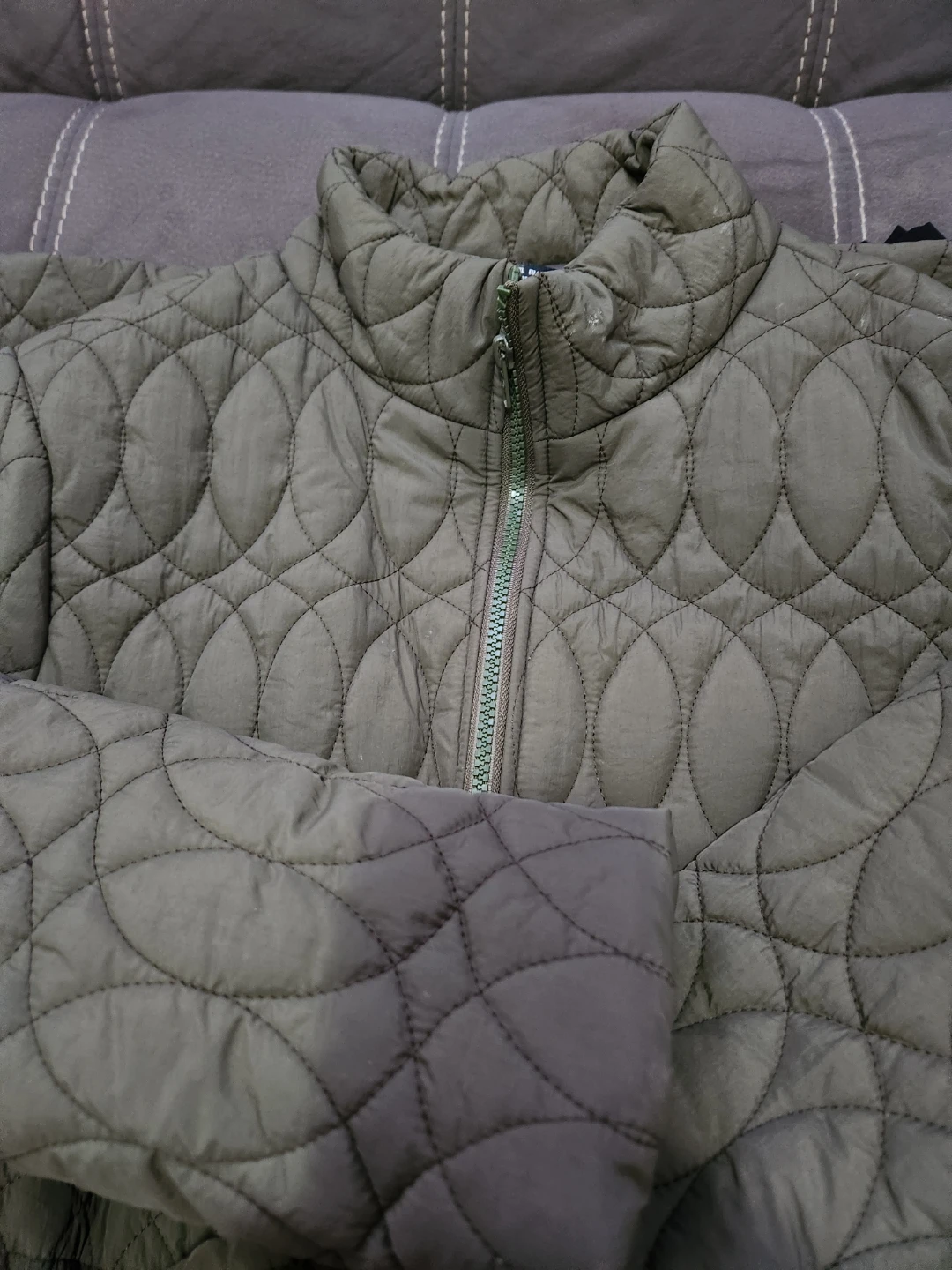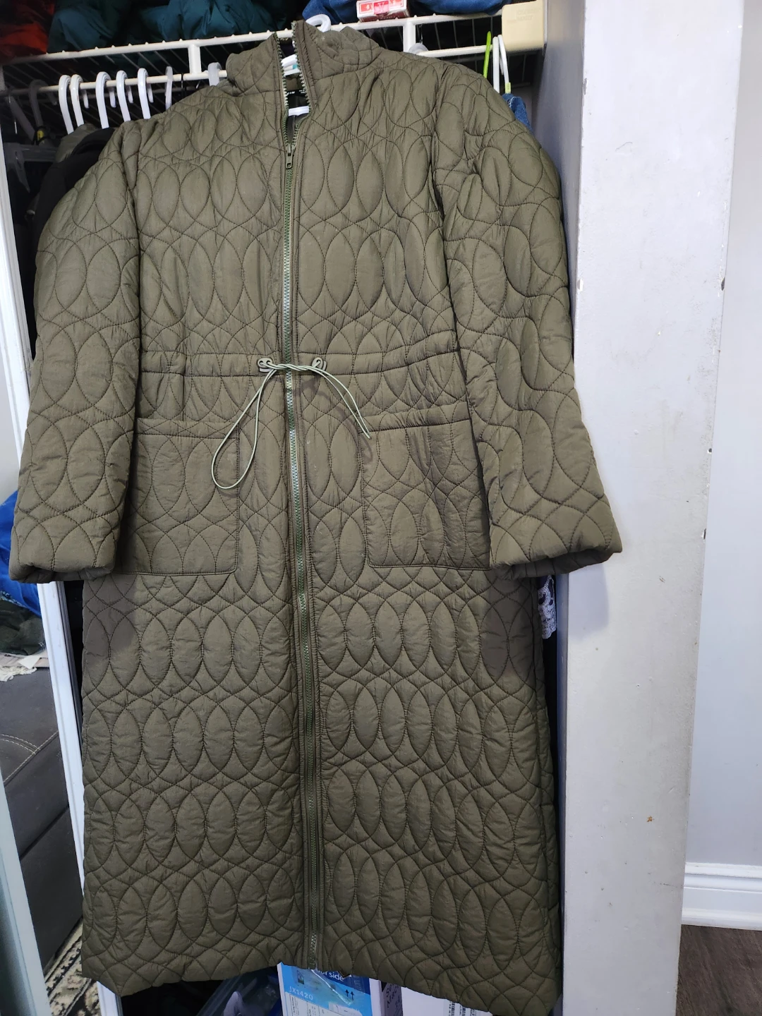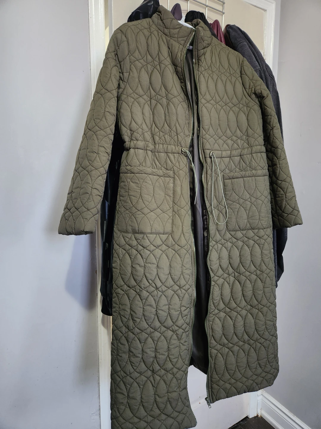 A stylish quilted coat in a unique olive green colour! It's in great shape and ready for a new home. Perfect for adding a touch of warmth and style to your wardrobe