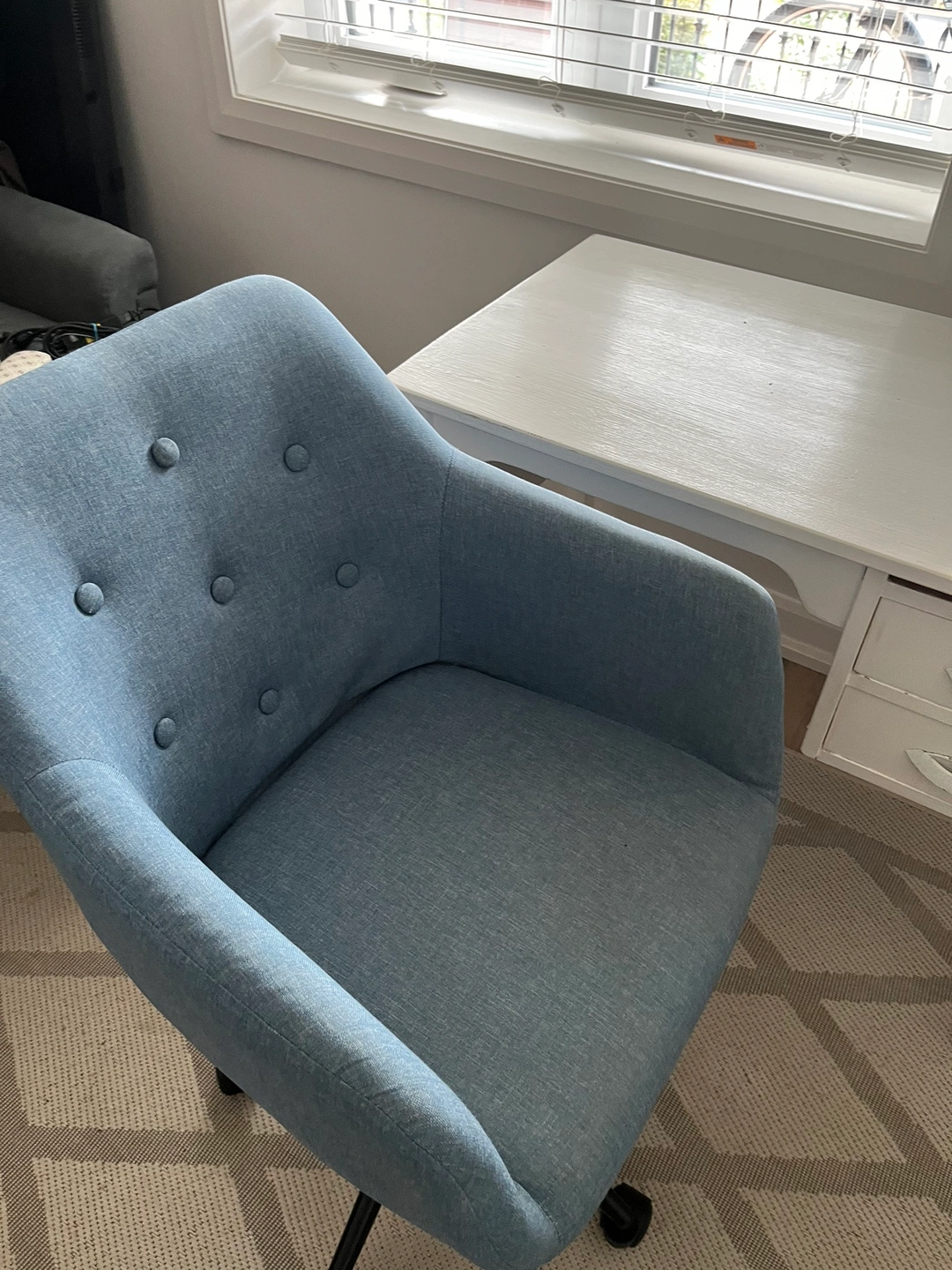 A blue swivel office chair with a tufted back. The chair is on wheels. The chair has a black frame. The chair is in good condition. It is very comfortable. There are no marks on the fabric. The seat is a little bit stained. The wheels spin easily. The chair is in great condition.