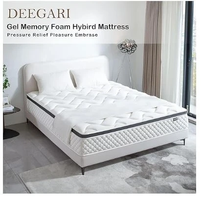 Selling a DEEGARI Gel Memory Foam Hybrid Mattress in Queen size! This mattress features a cooling knitted fabric, barrier fibre, gel memory foam, high-density foam, individually wrapped coils, and support foam. It measures 14 inches in height, 80 inches in length, and 60 inches in width. It's designed for pressure relief and pleasure embrace
