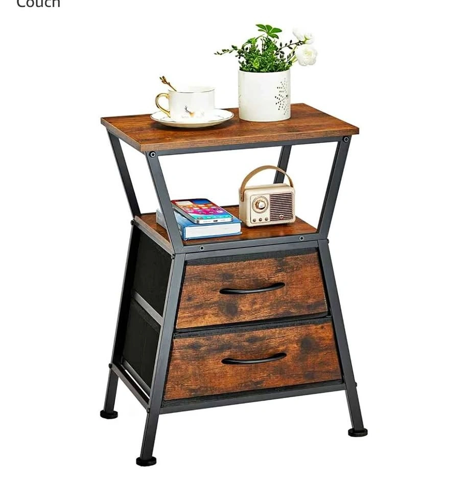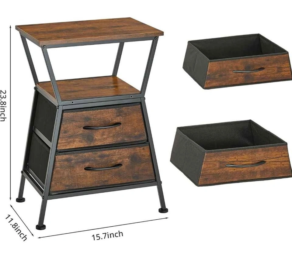 Stylish little end table with a cool rustic wood vibe and a black metal frame. It has 2 fabric drawers for your things. Super handy next to your couch or bed. Measures about 23.8 inches tall, 15.7 inches wide, and 11.8 inches deep.