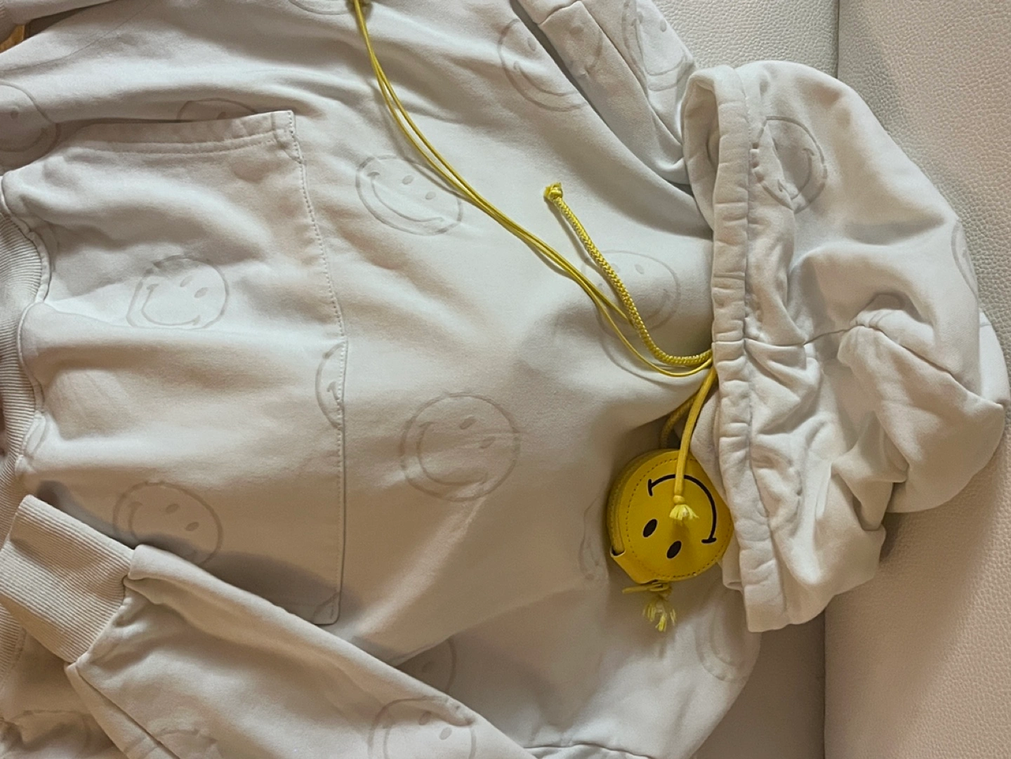 White hoodie with a yellow smiley face teddy bear attached. Allover smiley face pattern.