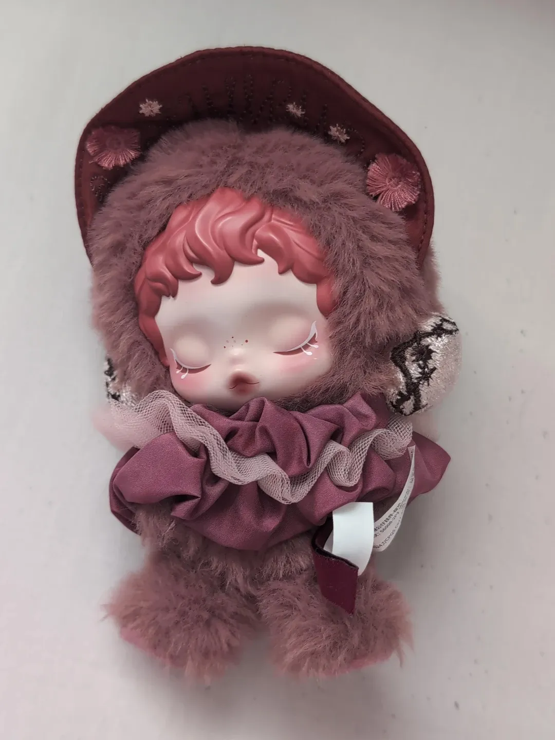 A fuzzy plush doll with a burgundy hat and pink hair. It has delicate painted facial features and is wearing a ruffled dress. This doll has a soft, furry body and embroidered details on its hat. Comes with card