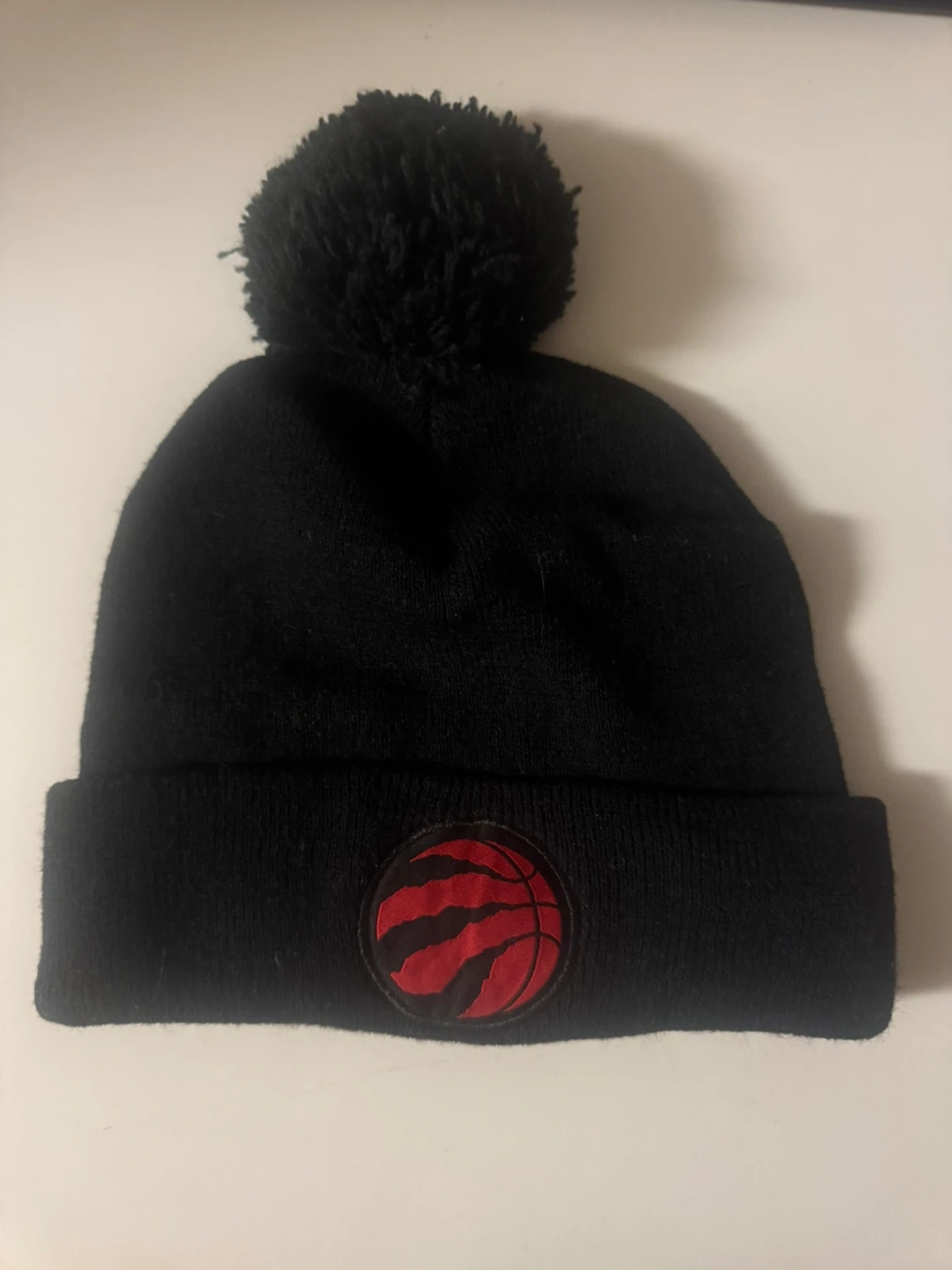 This is a black toque featuring both the Toronto Raptors logo and a Coors Light patch. It has a pom pom on top. It's a knit hat perfect for cooler weather.