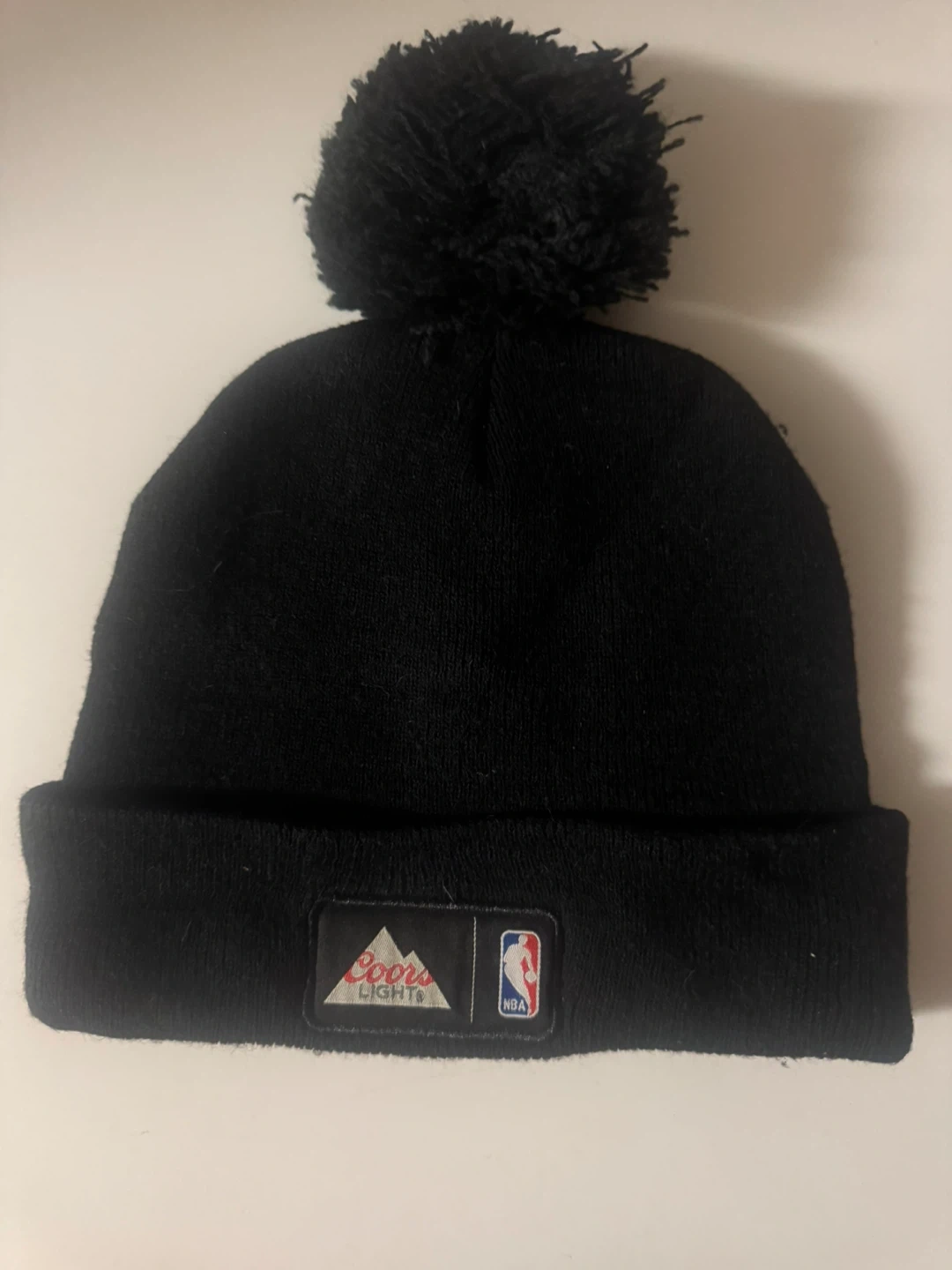 This is a black toque featuring both the Toronto Raptors logo and a Coors Light patch. It has a pom pom on top. It's a knit hat perfect for cooler weather.