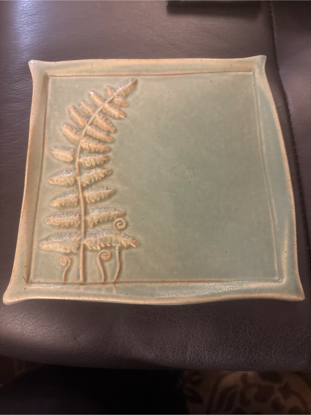 Handcrafted ceramic plate featuring a detailed fern embossed design. This piece is a light blue-green glaze. It's made in Canada.