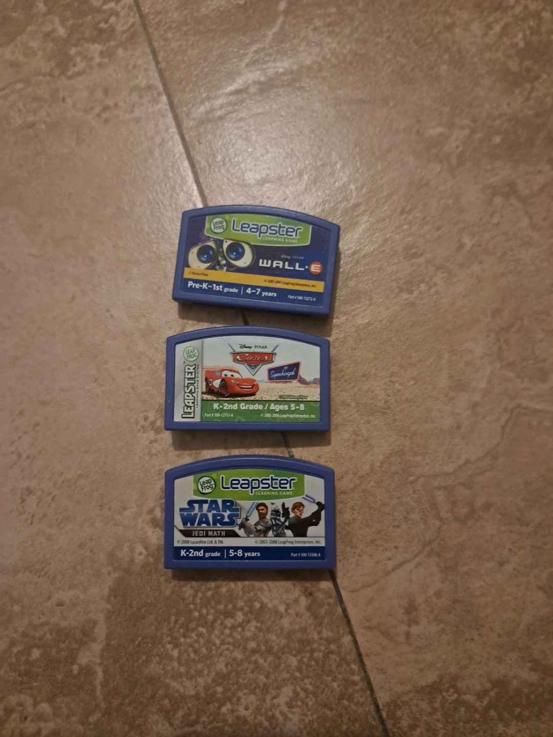 Three Leapster learning game cartridges are included: Cars 'Supercharged' for K-2nd Grade (Ages 5-8) and WALL-E for Pre-K-1st Grade (Ages 4-7) and StarWars for K-2nd grade(Ages 5-8). These cartridges work with the Leapster Learning Game System.