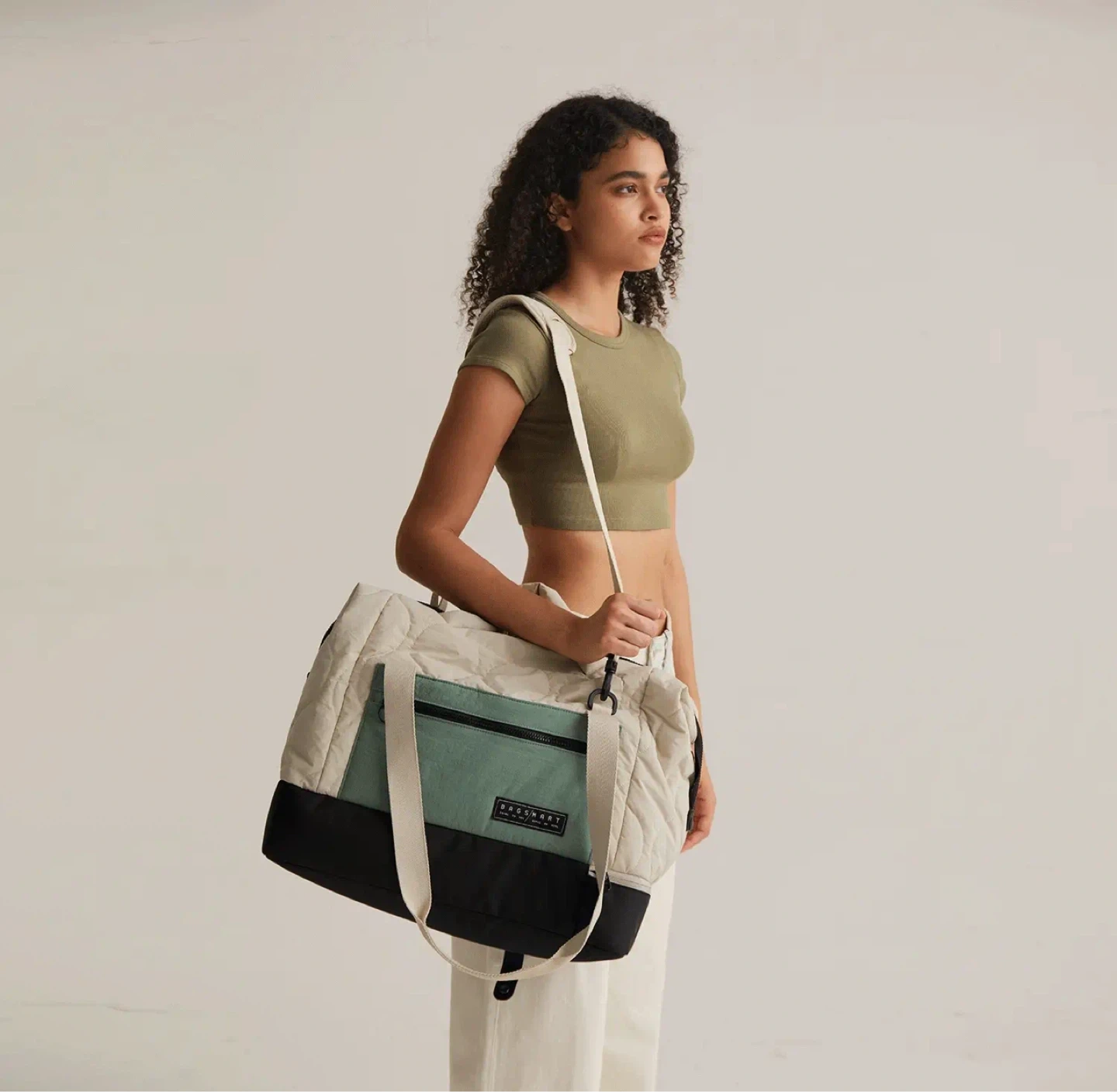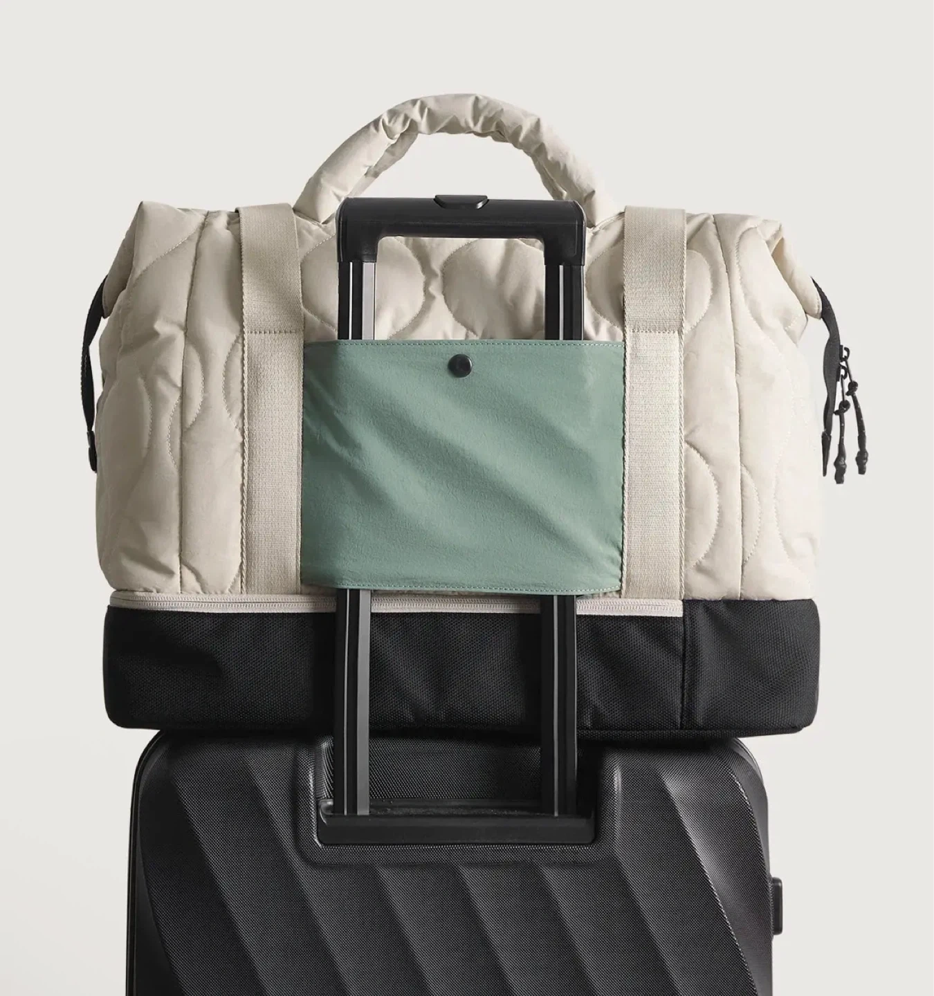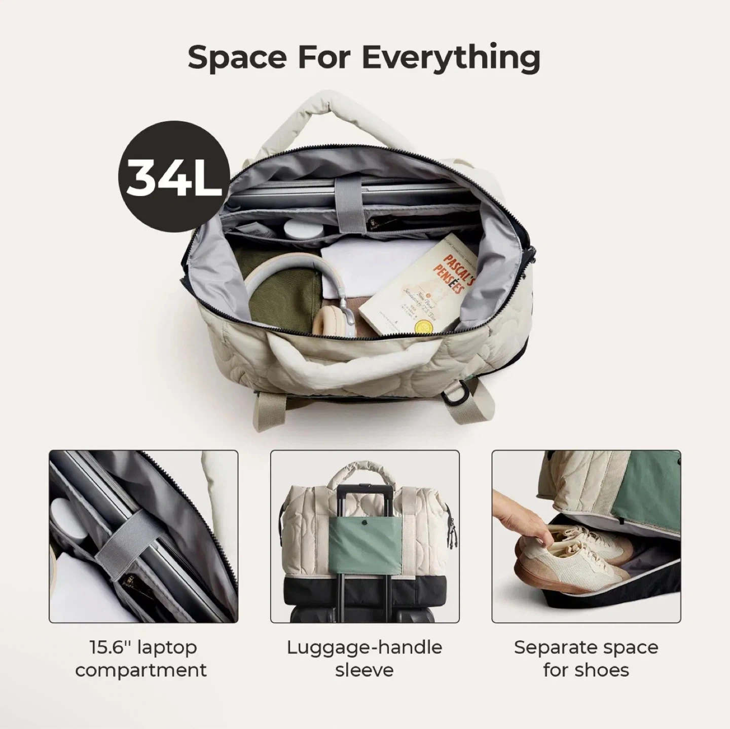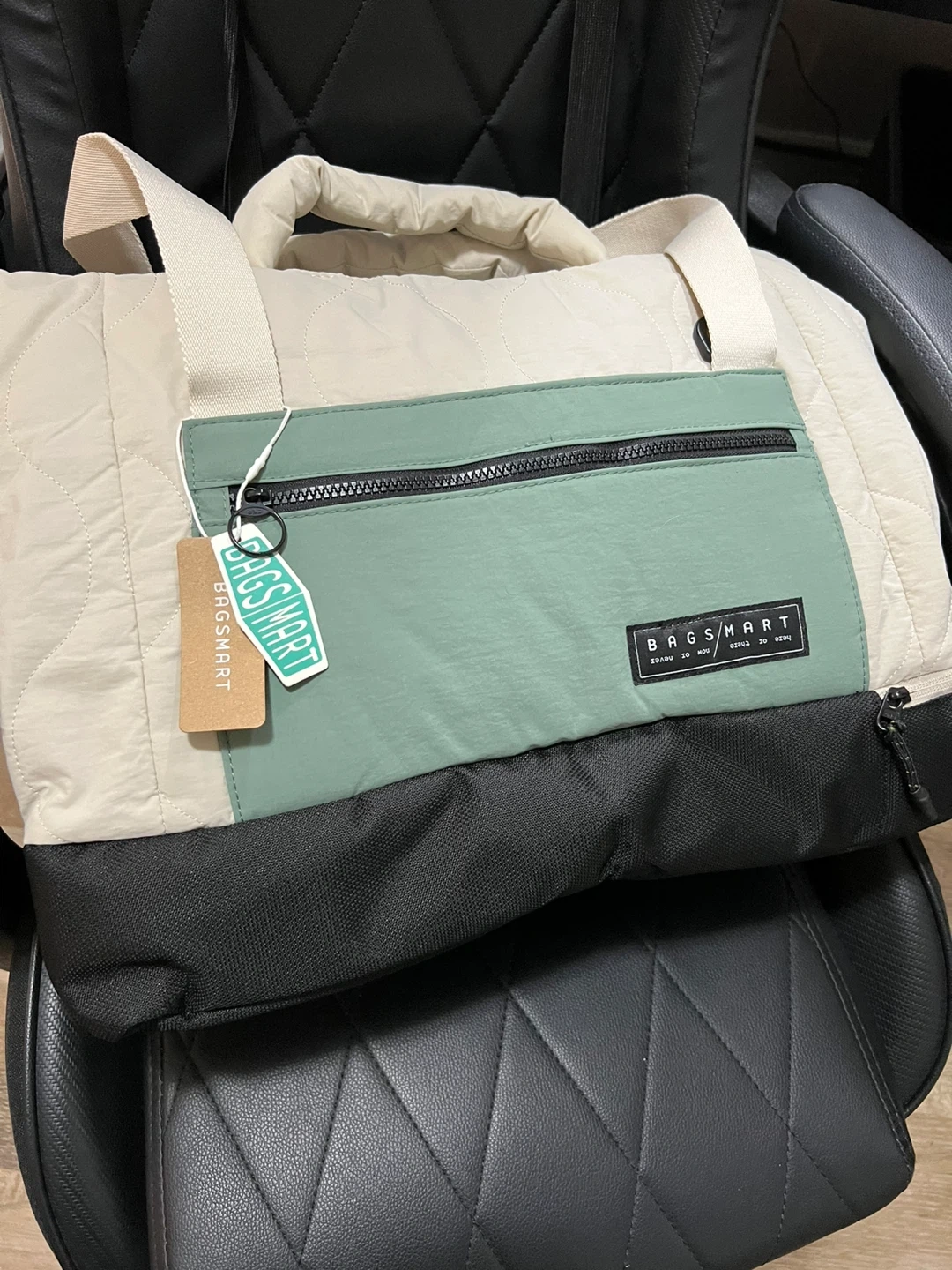 Bagsmart quilted duffel bag in cream and green. It's 34L capacity and features a 15.6" laptop compartment and a separate shoe compartment. It also has a luggage handle sleeve.