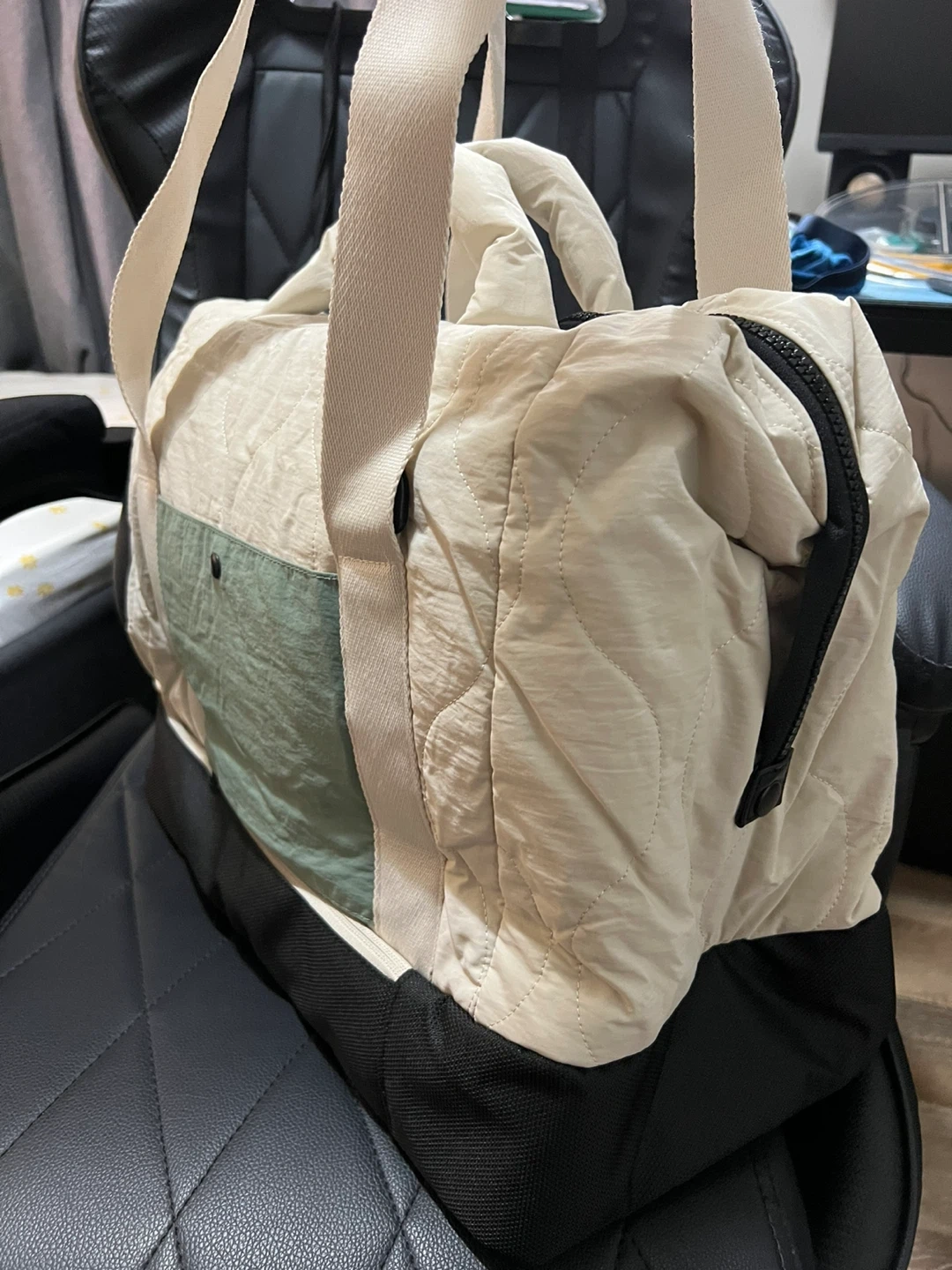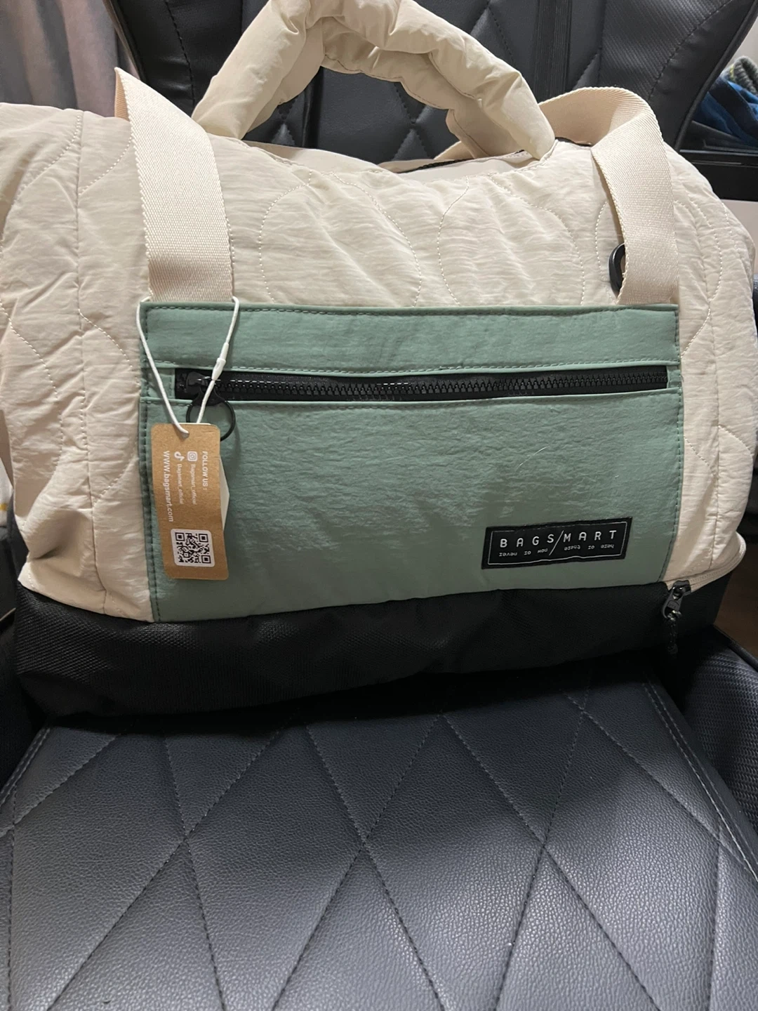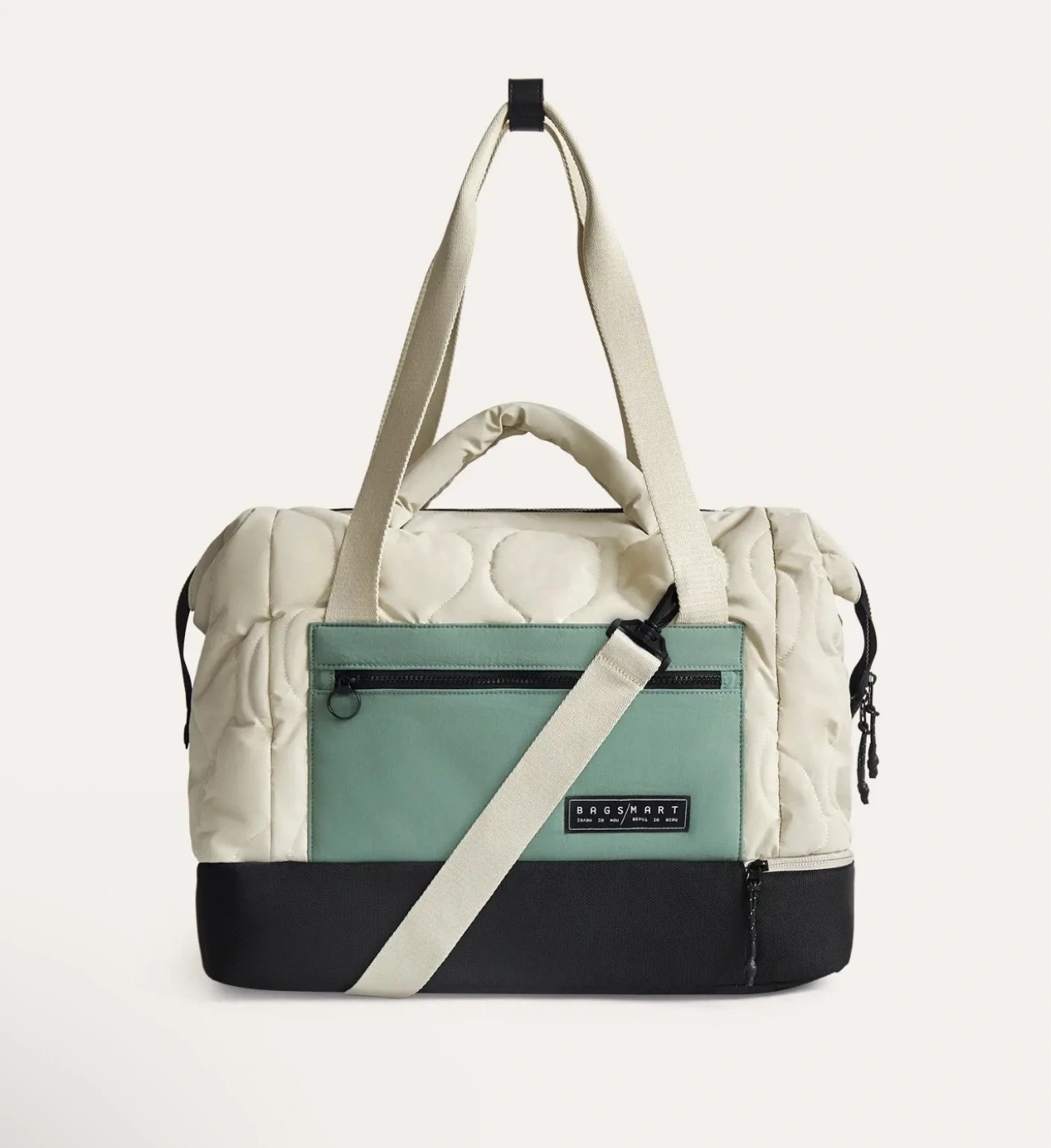 Bagsmart quilted duffel bag in cream and green. It's 34L capacity and features a 15.6" laptop compartment and a separate shoe compartment. It also has a luggage handle sleeve.