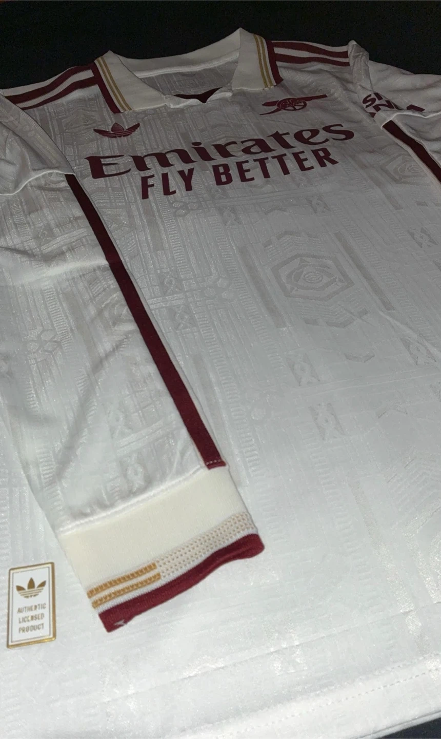 This is an Arsenal jersey featuring the 'Emirates Fly Better' sponsor. It's an authentic licensed product made by Adidas. The jersey is white with maroon and gold accents.